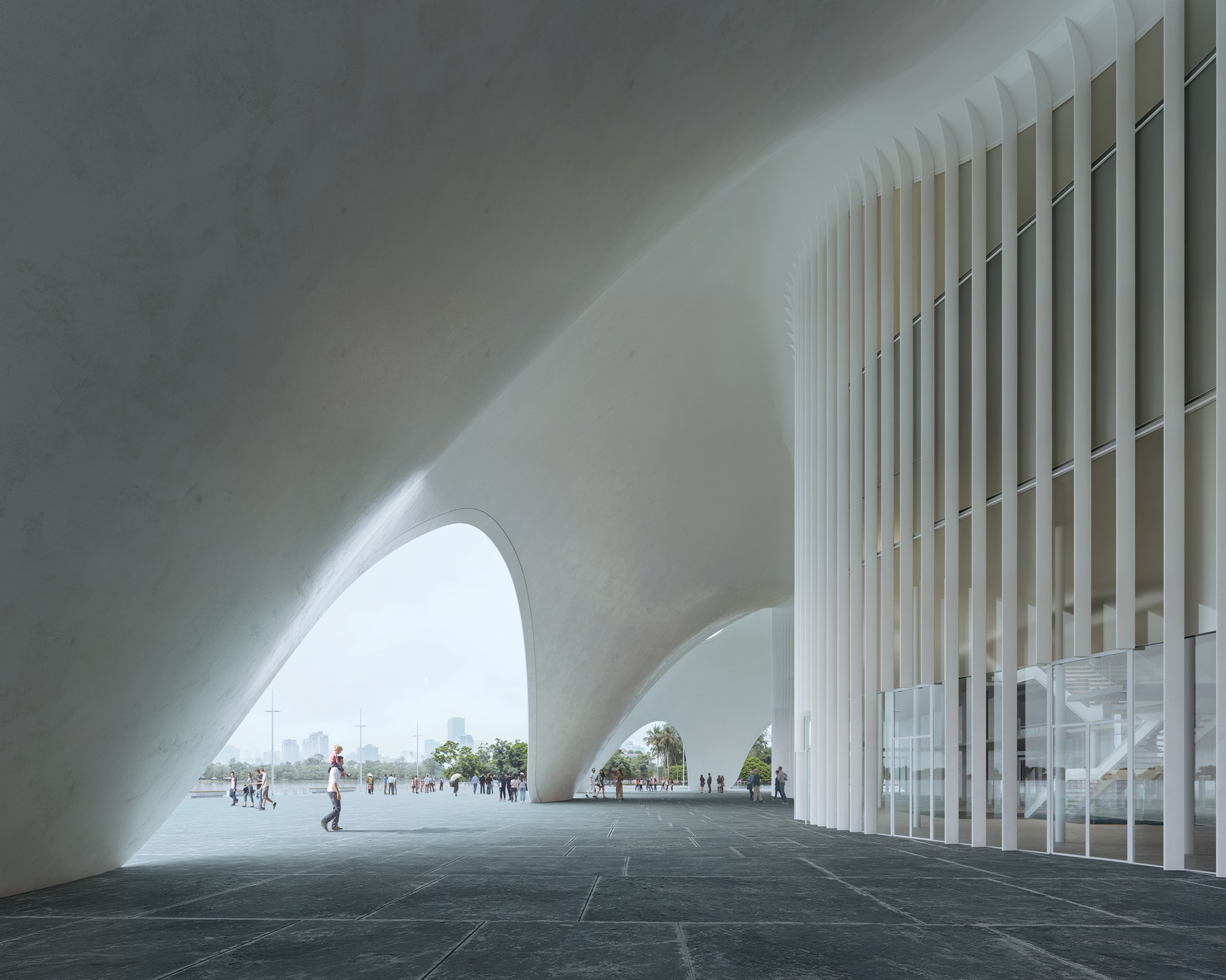 Dấu ấn đặc biệt của nhà hát là mái vòm lấy cảm hứng từ những gợn sóng hồ Tây, có kết cấu siêu mỏng, siêu chịu lực và được phủ vật liệu tạo hiệu ứng xà cừ, phản chiếu sắc nước theo ánh sáng từng thời điểm trong ngày.