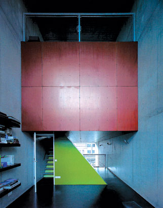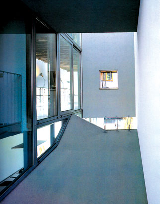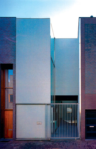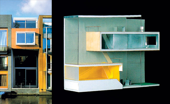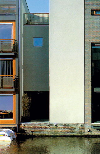 Mặt tiền nhìn ra kênh đào của nhà số 18. Khối chứa phòng ngủ là phần liên hệ giữa trong và ngoài. Mô hình chỉ rõ các không gian chức năng nằm trong khối, giữa các khối, bên trên và bên dưới các khối. Vì chiều rộng luôn cố định nên sự tìm kiếm không gian được phát triển theo chiều cao.