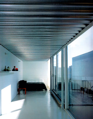 Phòng ngủ ở tầng trên cùng. Với tường ngăn hoàn toàn bằng kính, không gian được mở rộng ra gấp đôi.