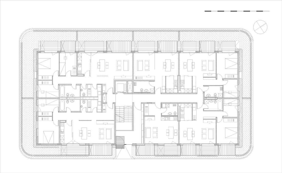Dự án này yêu cầu 30 căn hộ với các kích thước và hệ kết cấu khác nhau, đa dạng từ các căn hộ studio cho đến các căn hộ với 3 phòng ngủ. Các căn hộ đều có diện tích nhỏ với các phòng có kích thước tối thiểu theo các tiêu chuẩn xây dựng của Slovenia. Trong thiết kế không có các hệ vách chịu lực trong các căn hộ, và vì thế mang lại sự linh hoạt và khả năng sắp xếp lại công năng bên trong.