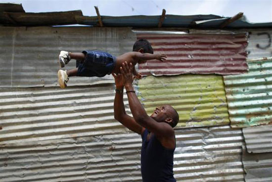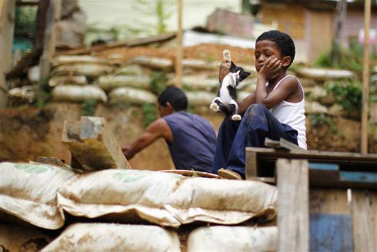 Một cậu bé chơi với con mèo trong khi cha cậu làm việc tại khu ổ chuột Las Maya.