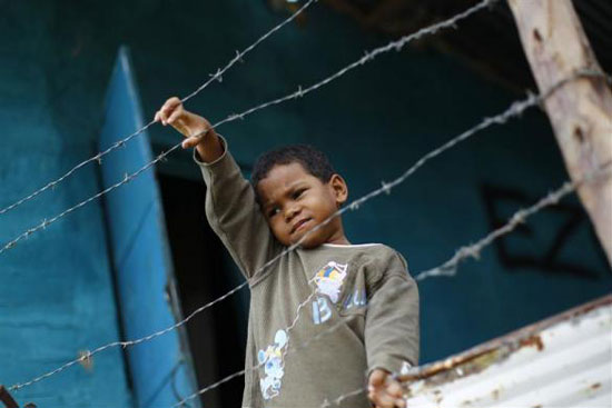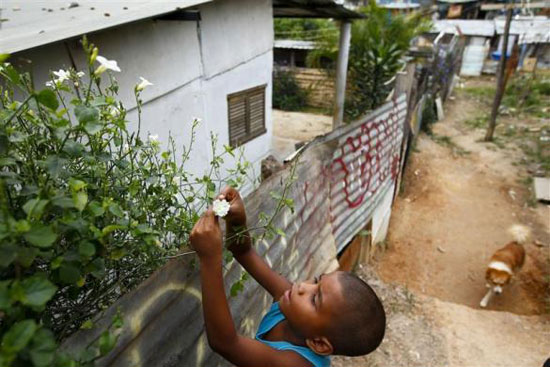 Một cậu bé ngắt hoa treo trên hàng rào khu ổ chuột Las Maya.
