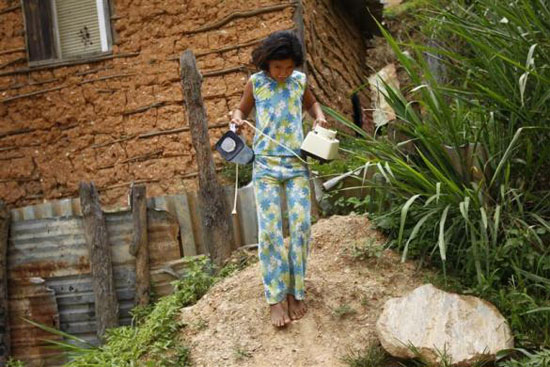 Một bé gái chạy bên ngoài một căn lều gỗ ở khu ổ chuột Las Maya.