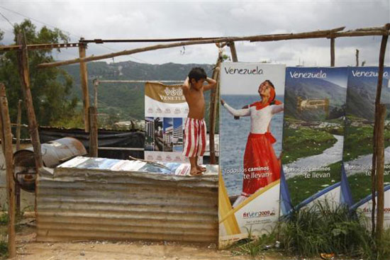 Một cậu bé đứng cạnh các áp phích quảng bá du lịch tại khu ổ chuột Las Maya.