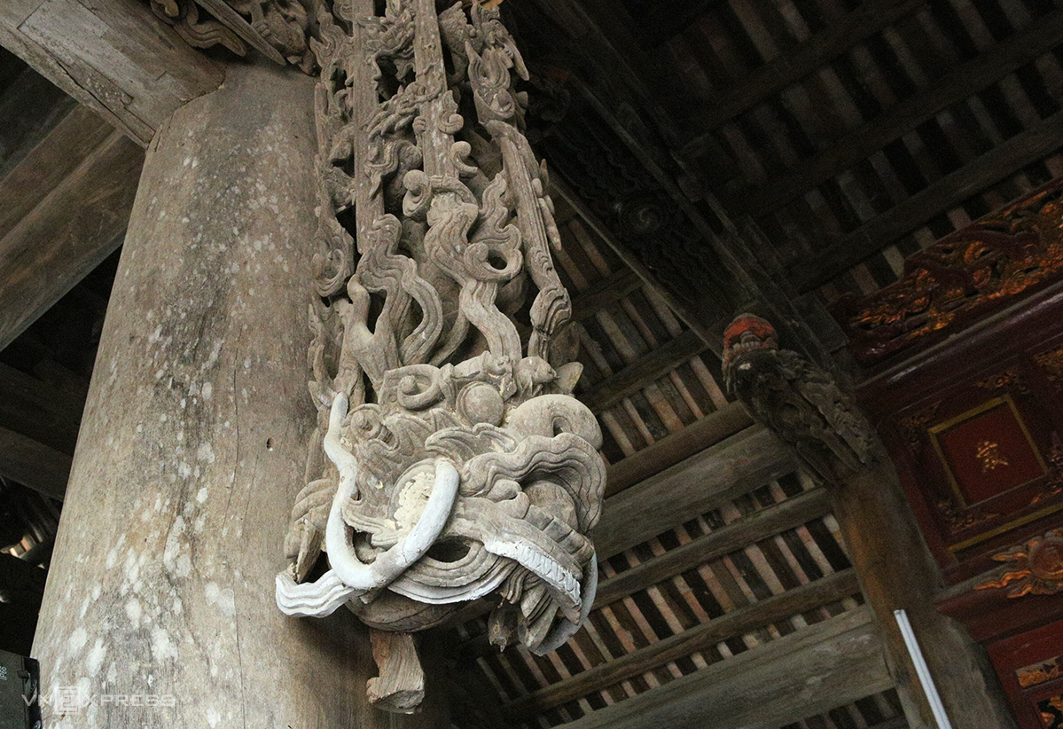 Trong cuốn Đình Việt Nam, tác giả Hà Văn Tấn và Nguyễn Văn Kự cũng viết: Trên xà, kèo, cột đều được chạm trổ rất tinh vi và sinh động hình mây lá, rồng với những bầy rồng con, chim phượng vàng.
