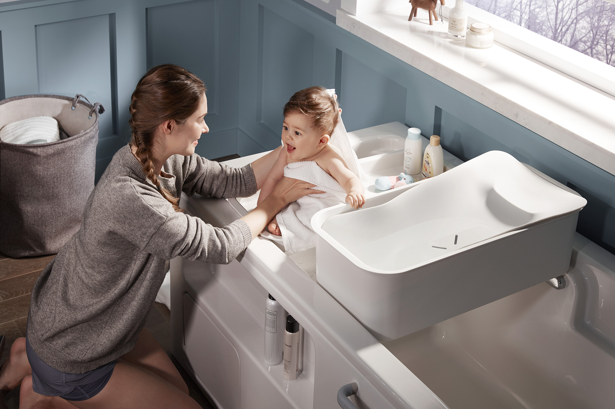 Chậu rửa Family Care: Khác biệt hoàn toàn so với những thiết kế chậu rửa trước đây, dòng sản phẩm này tối đa hóa không gian sử dụng với khu vực rửa lớn và sâu hơn cùng đường thoát nước được lắp đặt ở phía sau. Khu vực khô và ướt được thiết kế tách biệt để đảm bảo các thao tác vệ sinh cá nhân trở nên dễ dàng và thêm nhiều không gian để sắp xếp, cất giữ vật dụng vệ sinh, sản phẩm trang trí. Sự an toàn và thoải mái luôn là tiêu chí ưu tiên hàng đầu của Kohler, mang đến thiết kế với bề mặt nhẵn mịn và các chi tiết góc bo tròn mềm mại.