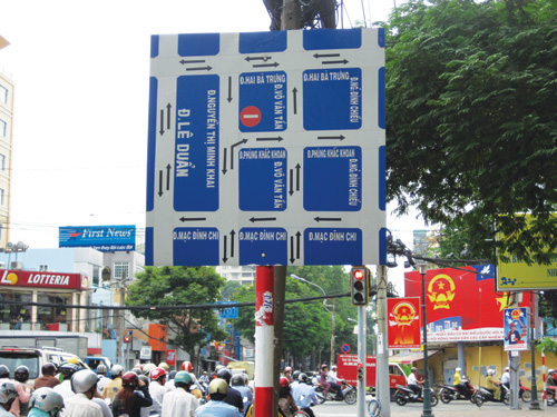 Biển báo hướng dẫn đường kiểu này không tài nào vừa chạy vừa đọc. Ảnh chụp trên đường Nguyễn Thị Minh Khai, Q.1, TPHCM – Ảnh: Minh Nam