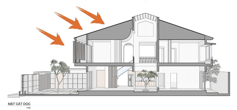 Cụ thể, dưới một bộ mái lớn và cao thì phòng khách hoặc gian thờ sẽ phù hợp hơn là phòng ngủ hay khu vệ sinh. Hoặc một khoảng thông tầng sẽ hợp đặt chỗ sinh hoạt gia đình, trong khi các phòng thấp hoặc gác lửng sẽ hài hòa tỷ lệ chỗ ngủ, kho áp mái… Những điều này với người có chuyên môn có thể dễ dàng, nhưng gia chủ thì không phải ai cũng xác định được chỗ nào cao sẽ bố trí công năng gì, chỗ nào thấp nên làm phòng ra sao… nếu như áp đặt từ đầu một bộ mái cao vút, hoặc một cái “chóp củ hành” để làm dáng bên ngoài mà không có chức năng gì bên trong.