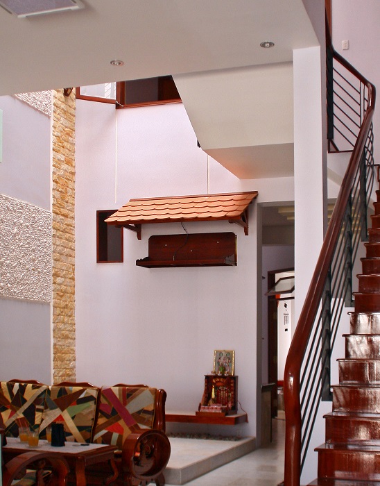 Đơn cử ví dụ gia chủ hay đặt phòng thờ, bàn thờ trên lầu thượng để “trên là trời, dưới là con cháu”, bàn thờ theo kinh nghiệm dân gian không để cho cái gì “đè” lên trên trừ bộ mái! Từ nguyên tắc này, có rất nhiều cách sáng tạo để đảm bảo yêu cầu phong thủy và công năng trong thời hiện đại. Nếu ngại đặt phòng thờ trên lầu thượng phải leo trèo cao quá thì gia chủ có thể bố trí dưới trệt, trên lửng, tại sân trong… miễn sao có khoảng thông thiên bên trên bàn thờ (thông thoáng, lấy sáng, thoát mùi nhang khói) và cấu trúc các không gian khác sao cho không ảnh hưởng, va chạm đến vị trí thờ cúng. Mái nhà khi đó có thể là mái kính, mái bằng có khe thông gió ngang… tương ứng cách bố trí, tạo một khoảng trục thẳng từ trên cao xuống khu vực bàn thờ, vừa thông thoáng tốt vừa không ảnh hưởng ý nghĩa tâm linh.