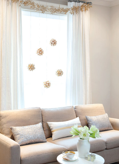 Ảnh phải : Khung cửa sổ lớn được sử dụng như tấm phông làm bật lên những đồ trang trí theo mùa. Những chùm quả cầu thả từ thanh treo rèm cùng gối và đệm màu bạc và vàng kim trên chiếc ghế bành nhìn thật hài hòa.