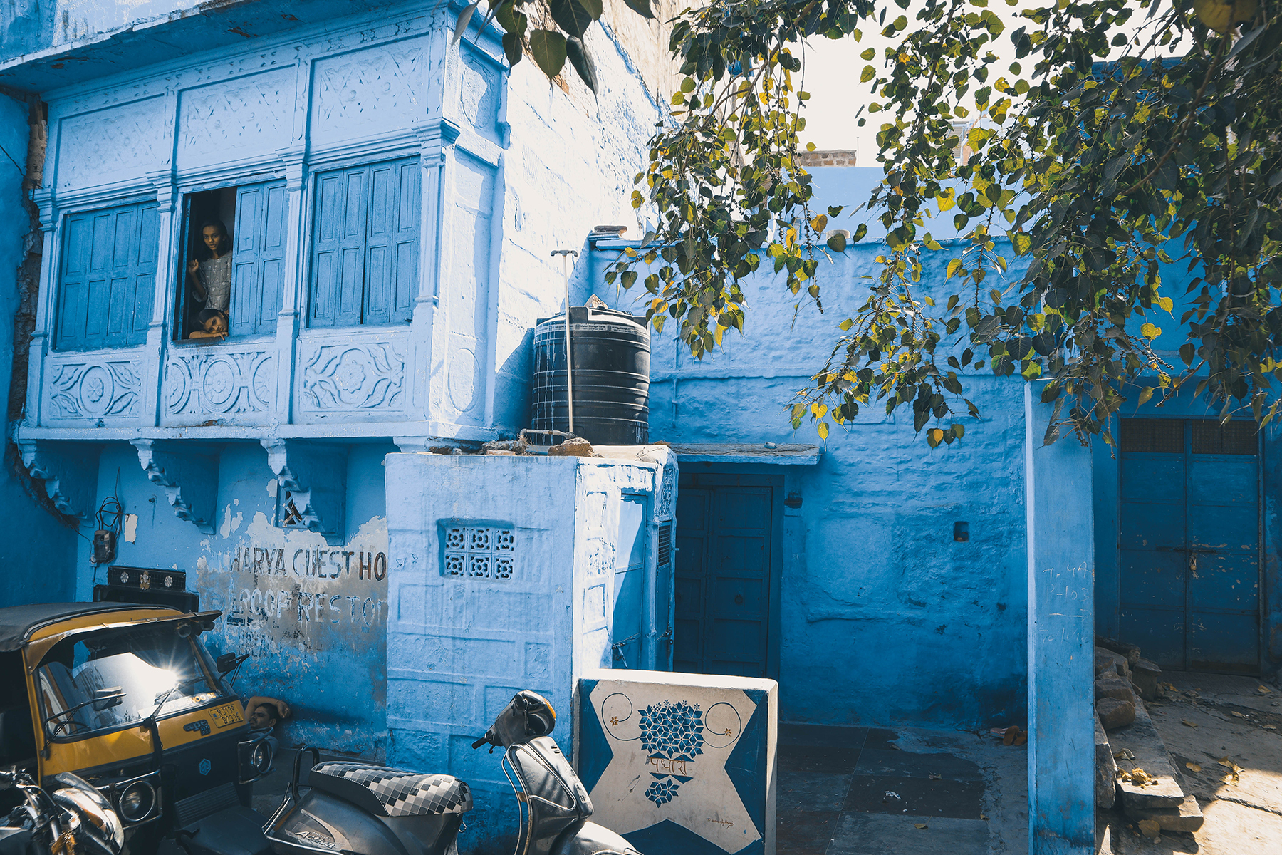 Một buổi sáng thảnh thơi đi tìm những mảng xanh của Jodhpur sẽ mở ra nhiều khung hình đẹp và bình dị của thành phố này. Đặt chân tới Jodhpur, bạn sẽ có cả một bảng màu xanh để bạn phối cho những bức ảnh của mình. Màu xanh nơi đây không thuần sắc xanh dương mà xen lẫn xanh chàm indigo, xanh navy, xanh cerulean nhã nhặn hay màu xanh thẫm cobalt.