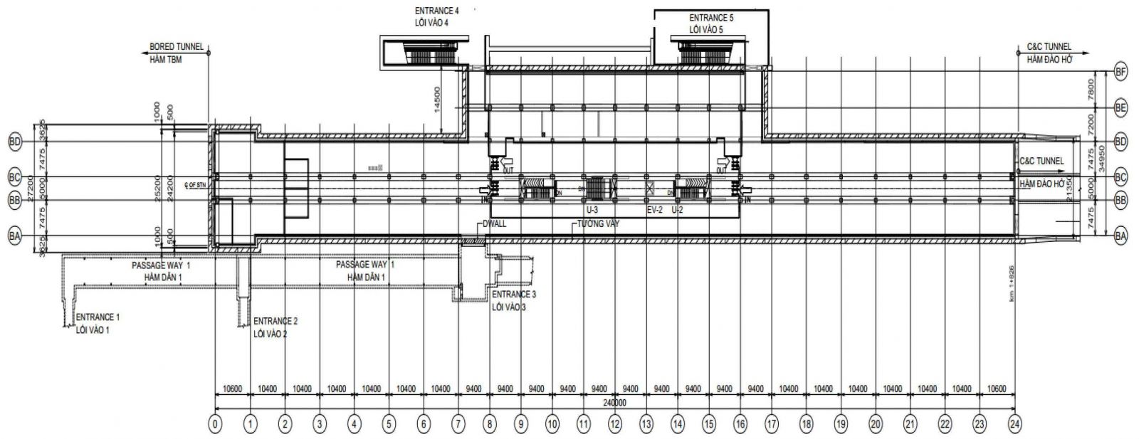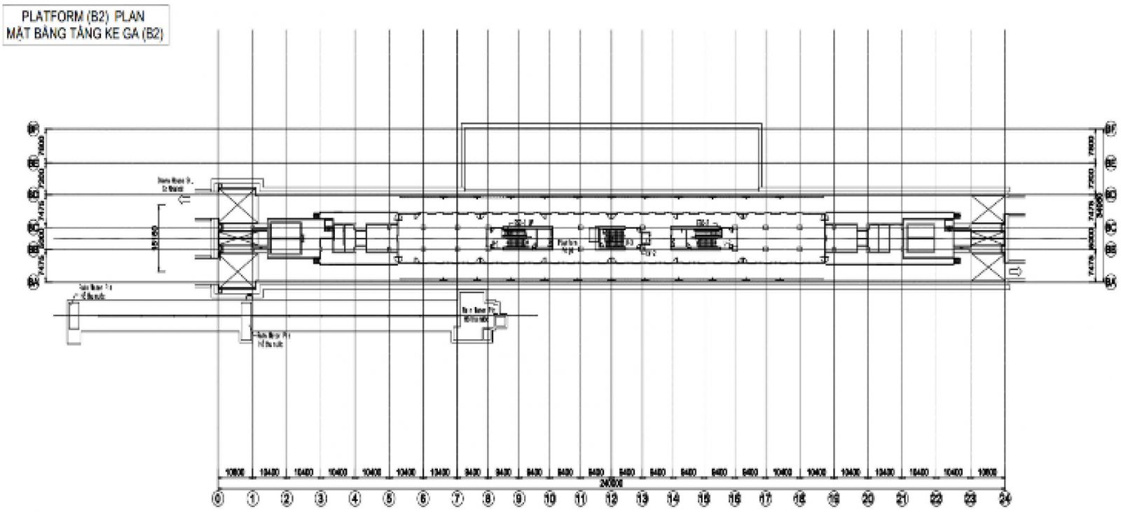 Với quy mô lớn, ga có chiều dài 240m, chiều rộng 34,5m và độ sâu khoảng 20m, được thiết kế với hai tầng ngầm chính: tầng B1 bao gồm khu vực sảnh, phòng bán vé, kiểm soát vé và các tiện ích hành khách; tầng B2 là khu vực sân ga với hai đường ray và một ke ga đảo, tối ưu hóa luồng di chuyển hành khách (Hình 4-5). Nhà ga được xây dựng để đáp ứng lưu lượng hành khách cao, kết nối khu vực trung tâm với các quận lân cận và các khu đô thị mới như Vinhomes Golden River.