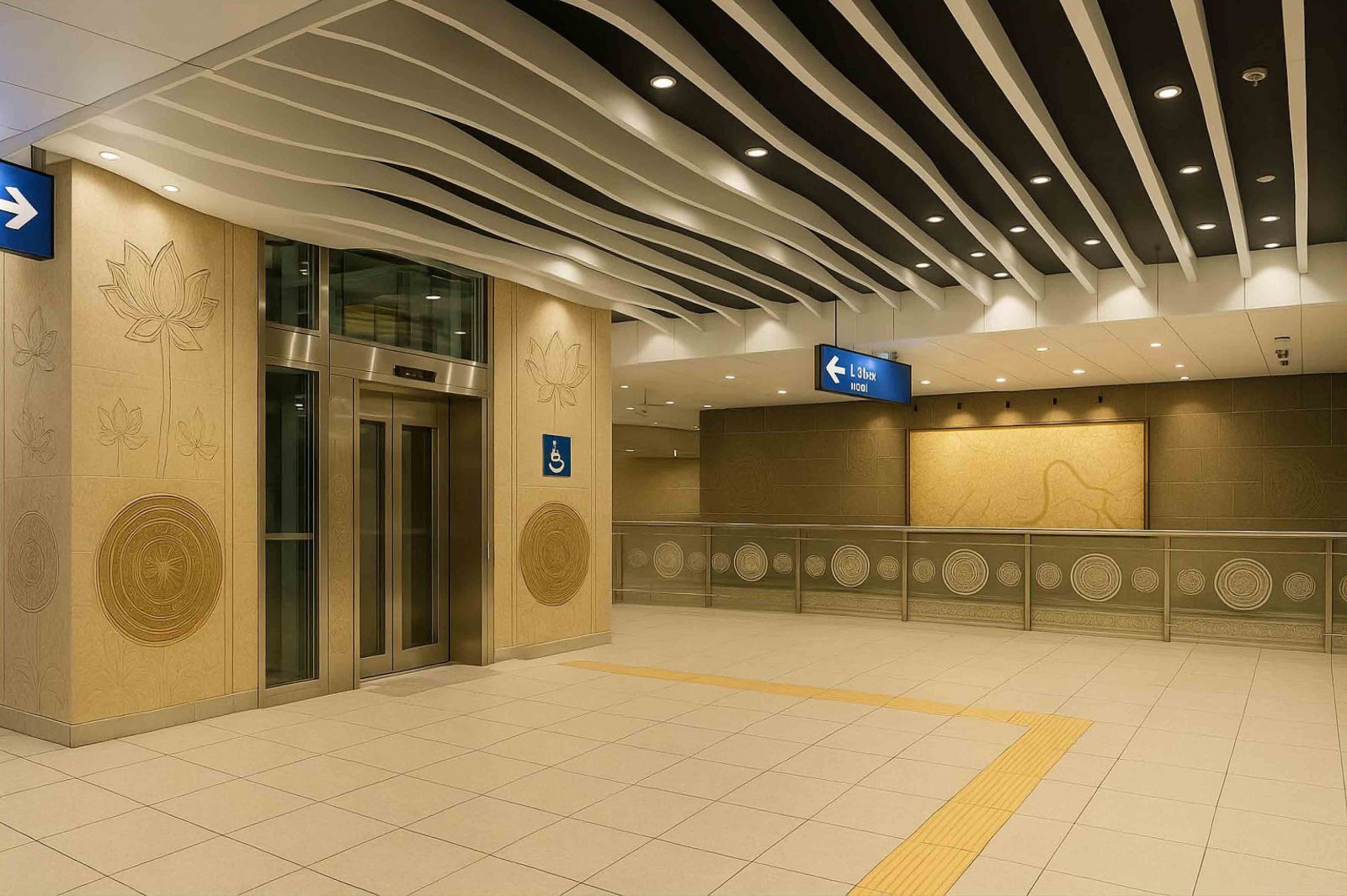 – Kính cường lực tích hợp LED: Tạo hiệu ứng ánh sáng động, mô phỏng sóng nước hoặc hình ảnh văn hóa, như tại khu vực ke ga, tăng trải nghiệm thị giác cho hành khách. Hình 15 mô tả cách sử dụng kính cường lực tích hợp LED ở khu vực ke ga, tạo hiệu ứng chuyển động kết hợp với các họa tiết mang tính chất văn hóa – lịch sử.