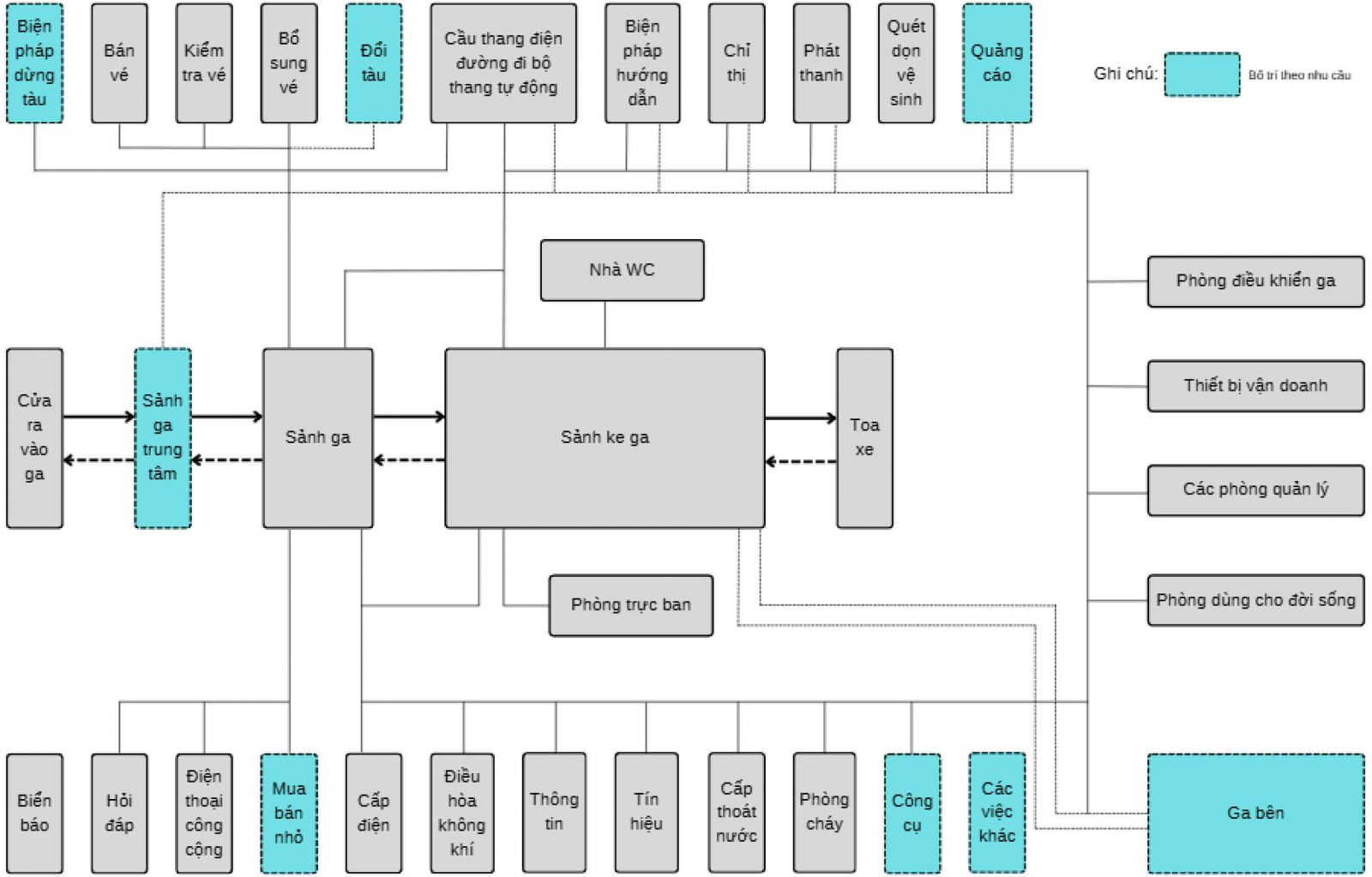 Các khu vực chính như sảnh ga, sảnh ke ga, bán vé và kiểm tra vé được bố trí hợp lý, đảm bảo luồng di chuyển nhanh chóng, an toàn. Cầu thang, thang cuốn và lối đi tự động hỗ trợ tiếp cận cho mọi đối tượng. Hệ thống kỹ thuật, bao gồm phòng điều khiển, cấp điện, điều hòa, phòng cháy chữa cháy, đảm bảo hoạt động ổn định và ứng phó khẩn cấp. Tiện ích như nhà vệ sinh, máy bán hàng, cửa hàng nhỏ tạo không gian hiện đại, thân thiện, đồng thời tăng nguồn thu phụ trợ.