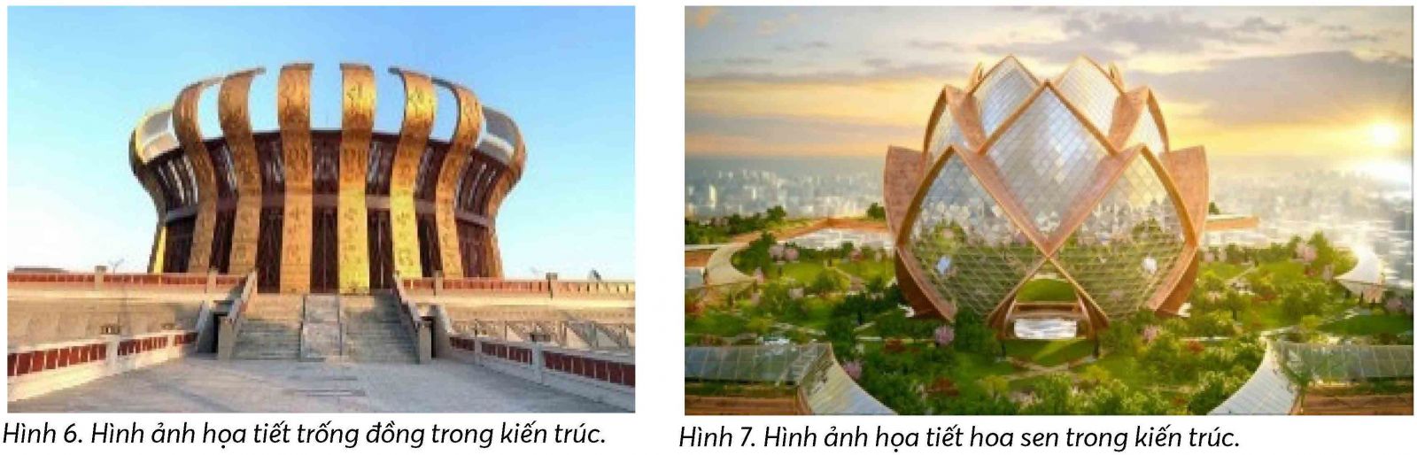 - Trống đồng Đông Sơn (Hình 6), hoa sen (Hình 7), hình gợn sóng, chạm trổ thuyền gỗ, phong cách Đông Dương.