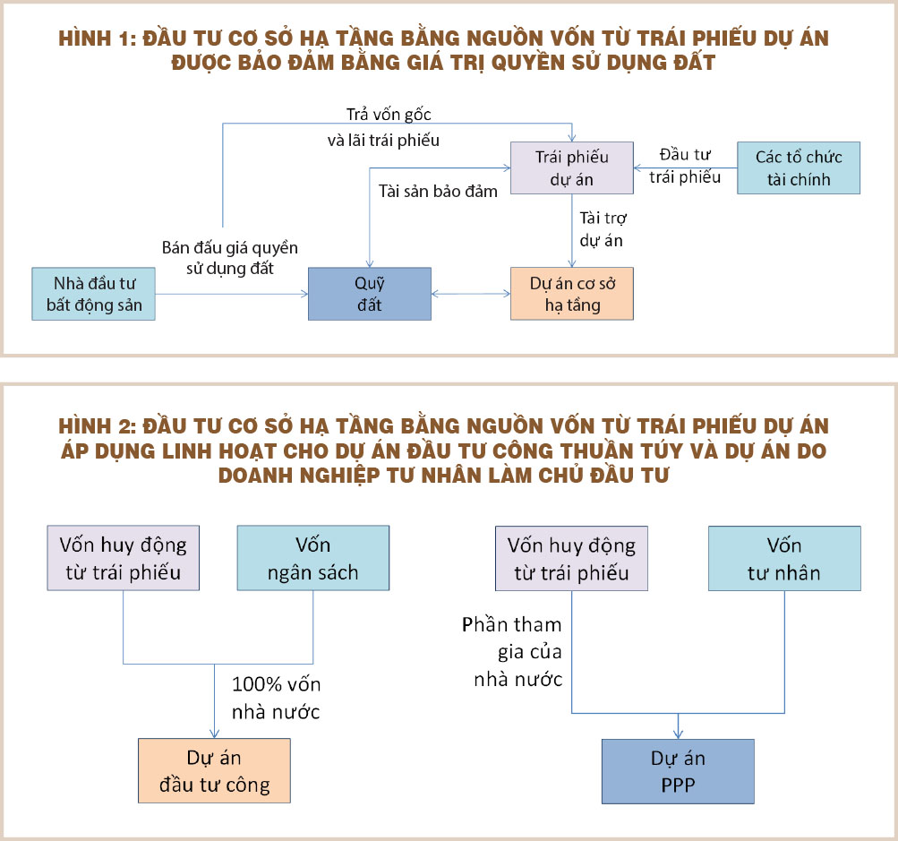 Các dự án đầu tư CSHT (cả dự án đầu tư công và dự án đầu tư với sự tham gia của doanh nghiệp tư nhân) có thể được tài trợ toàn phần hay một phần bằng trái phiếu dự án. Trái phiếu dự án được bảo đảm trước hết từ dòng tiền của các dự án CSHT có thu. Nhưng đối với các dự án công thuần túy hoặc dự án có nguồn thu hạn chế thì trái phiếu có thể được bảo đảm thêm bằng giá trị quyền sử dụng đất từ những quỹ đất công được xác định rõ, thay vì bảo đảm thông thường bằng ngân sách nhà nước. Quỹ đất công (ưu tiên đất gắn liền hay chịu tác động tích cực từ sự ra đời và đi vào vận hành của dự án) được xác định rõ ràng. Nguồn vốn huy động từ trái phiếu dự án được dùng để tài trợ trong quá trình xây dựng dự án. Khi dự án gần hoàn thành thì quyền sử dụng đất sẽ được bán đấu giá. Số tiền thu về sẽ dùng để hoàn trả nợ gốc và lãi của trái phiếu dự án. Hình 1 minh họa cho cơ chế huy động vốn này.