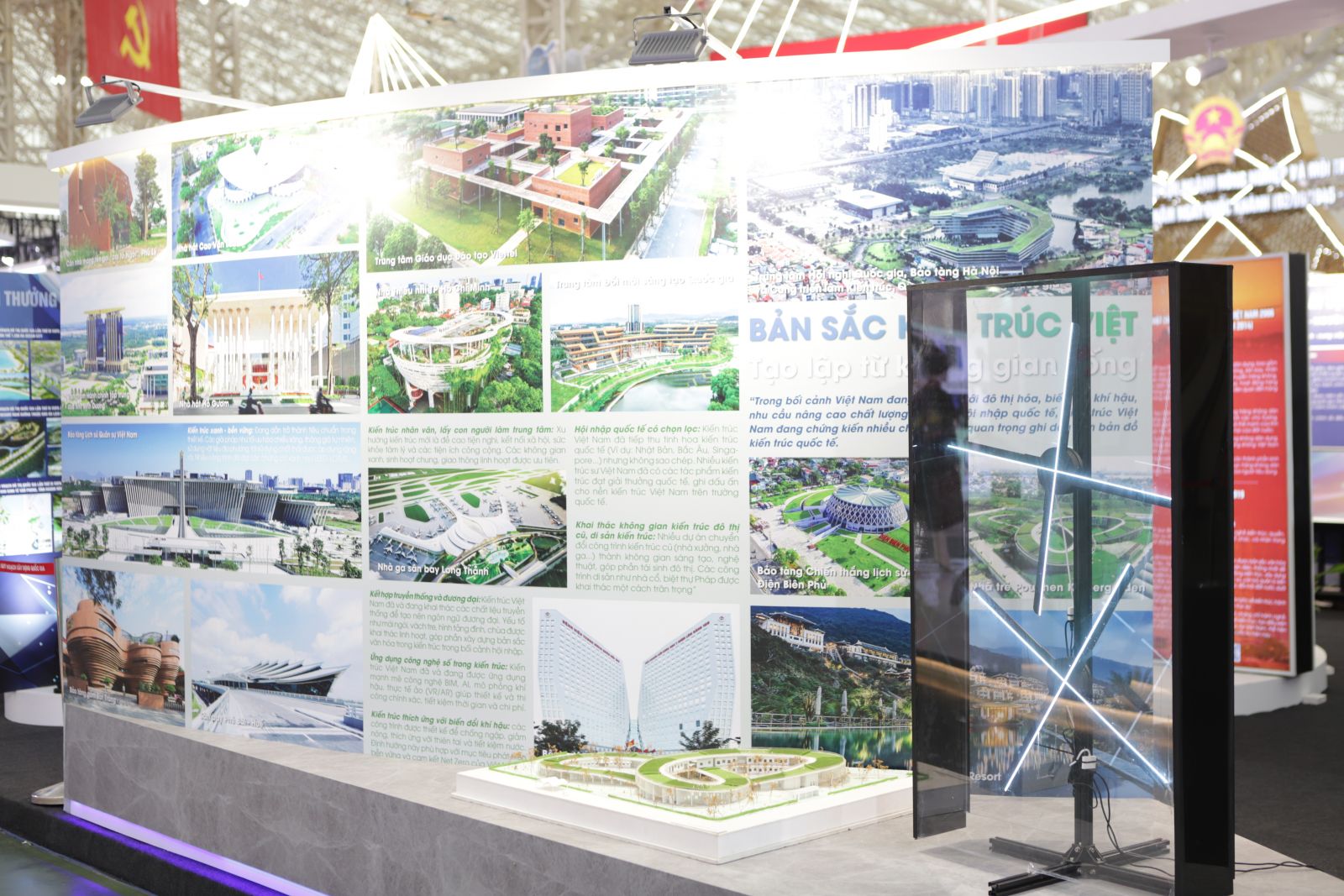 Khu trưng bày thành tựu về Quy hoạch – Kiến trúc, Phát triển đô thị – Nhà ở: Trưng bày bản đồ, mô hình, hình ảnh, thông tin… thể hiện công tácquy hoạch phủ kín 100% các tỉnh, thành phố, làm cơ sở để phát triển không gian đô thị – nông thôn bền vững. Hệ thống đô thị quốc gia ngày càng văn minh hiện đại với gần 900 đô thị, phát triển đồng bộ từ trung ương đến địa phương. Chính sách nhà ở cho mọi đối tượng được phủ kín, đã góp phần đảm bảo an sinh xã hội. Tiên phong ứng dụng mạnh mẽ công nghệ số trong quy hoạch – kiến trúc và quản lý đô thị, số hóa bản đồ quy hoạch, triển khai mô hình đô thị thông minh, áp dụng Digital Twin, GIS, AI, drone, camera thông minh… từng bước hội nhập với xu thế toàn cầu. Đó là những thành tựu khẳng định bước tiến vững chắc góp phần kiến tạo diện mạo mới cho đất nước.