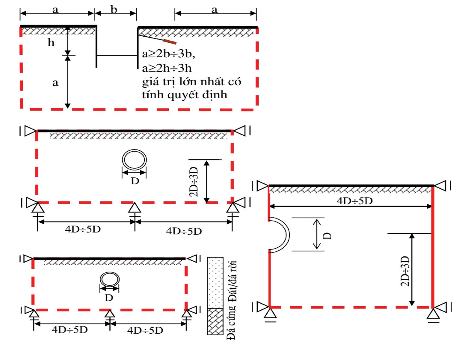 Theo hình 4, vùng ảnh hưởng của hố đào là 3 lần chiều sâu hố đào, với chiều sâu hố đào là 20 m thì phạm vi ảnh hưởng là 60 m hoặc lấy bằng 3 lần chiều rộng hố đào (trong trường hợp bề rộng hố đào lớn hơn chiều sâu).