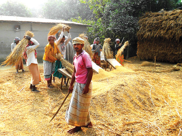 Mùa đông sông cạn, phải lội bộ qua triền sông mênh mông cát mới vào đến làng quê. Xóm nhỏ bên sông đã nôn nao thức cùng ngày lễ, hội mùa từ sớm. Hàng quán cho khách hành hương đã bày biện xong từ lâu. Đơn sơ mộc mạc nhưng lắm sắc màu những thứ đồ chơi, hàng hóa… của người địa phương. Những chậu bánh vòng, kẹo đường tán vàng hực, thèo lèo như đã mất dạng nơi quê nhà, giờ vẫn là món quà thú vị cho trẻ con và cả người lớn ở đây. Có những thứ hơi khác là các loại đậu được rang tẩm, nhuộm màu bày từng dãy mâm vun đầy, trông thật đẹp mắt. Đây là món ăn vặt ưa thích của người Bangladesh mà bạn có thể thấy khắp nơi nơi. Ngoài chợ đông vui, trong xóm cũng nhộn nhịp chẳng kém khi những cộ lúa mới gặt được chở từ đồng về sân để “đập lúa” – đúng nghĩa đen. Lúc đầu tôi hơi đượm buồn, khi thấy đã qua thập niên thứ hai của thiên niên kỷ mới mà nông dân ở đây chẳng có lấy chiếc thùng suốt lúa thô sơ đạp chân hay quay tay chứ nói gì đến máy suốt có động cơ. Các cô chú anh chị vẫn đập thẳng những bó lúa vào mấy tấm ván để hạt lúa rụng rồi gom lại. Trước sự chào đón thân tình ấm áp của bà con, tôi được biết thu hoạch vụ mùa này của làng cũng tương đối khá, nên bà con rất mừng.