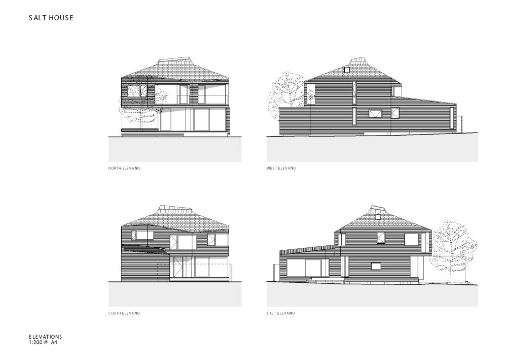 Sân của ngôi nhà hướng về phía nam, tầng đơn truyền thống đặc trưng cho cửa vào của những ngôi nhà riêng trở thành nơi tiếp khách của gia đình. Cả hai mặt tiền của ngôi nhà đều lắp kính, màn chắn bằng vật liệu chống thấm cho phép bắc chéo hệ thống thông gió và nhìn xuyên qua ngôi nhà. Cửa sổ và ban công mở tự do ngang mặt tiền ngôi nhà giúp cho việc lấy ánh sáng và tạo ra sự chuyển động. Tường bên ngòai và tầng trên được che bởi các lớp mái, một loại gỗ cứng bền lấy từ các khu rừng lâu năm khiến cho ngôi nhà rực rỡ sắc bạc. Mái nhà được làm bằng ngói đen nhân tạo, phù hợp với khung cảnh xung quanh trong khi vẫn tôn trọng được tính chính xác của việc đặt đường ống nước, mái dũa và cửa sổ trổ mái. Hội đồng Maldon cũng tỏ ra ngạc nhiên và hài lòng với những đề xuất ngôi nhà muối, và đã cho trưng bày dự án này tại triển lãm địa phương dành cho những công trình kiến trúc mới tại Essex, và đề cử giải thưởng cho ngôi nhà.