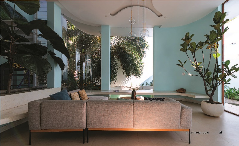 Tầng trệt có hệ kính mở rộng ra không gian xung quanh nhà. Nhưng vì khu đất cũng không quá rộng để tạo được nhiều cảnh quan sân vườn, nên phần hàng rào, kiến trúc sư đã tạo hình một bồn cây băng dài để đưa phần cây xanh lên cao tạo màu xanh khi nhìn từ lầu 1 và ưu tiên trồng những cây rủ để làm xanh mát khu vực tường bao quanh tầng trệt.