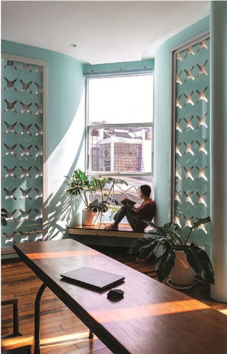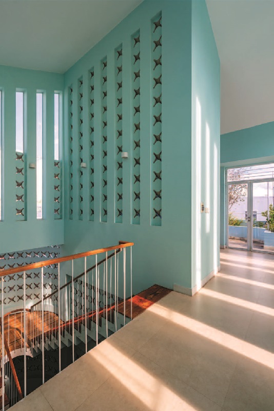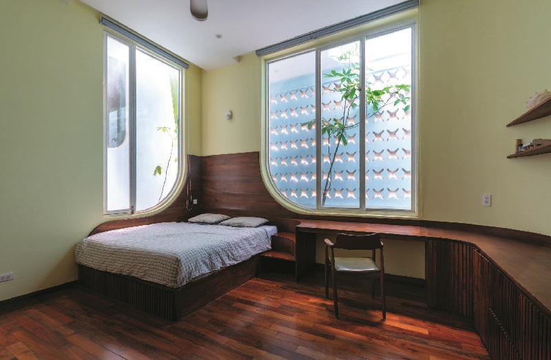 Không gian được ưu ái để gió và sáng là phòng sinh hoạt, học tập – nó như một phòng thư viện với nhiều sách để cho con và ba mẹ cùng đọc. Với yêu cầu này, kiến trúc sư đã mở nhiều cửa sổ và một hệ bông gió được thiết kế riêng như một điểm nhấn nhằm đưa cái nắng của vùng đất Tây Nguyên vào phòng một cách dịu nhẹ với hình dạng của những bông hoa bao quanh. Điểm nhấn hoa gió này cũng được sử dụng ở hầu hết các không gian trong nhà như một thể thống nhất.