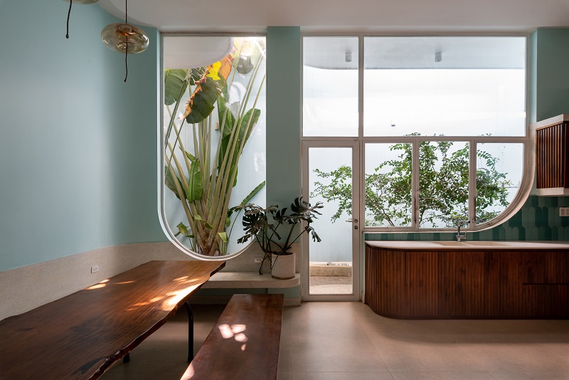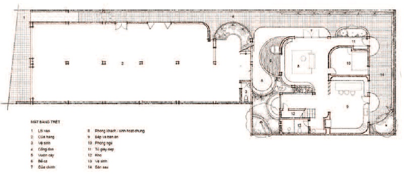 Với quy mô căn nhà ngoài khu vực kinh doanh của gia đình ở phía trước, còn lại kiến trúc sư tập trung “bày binh bố trận” cho không gian phía sau của gia đình có 4 thành viên (bố mẹ và 2 con nhỏ) nên cấu trúc căn nhà ưu tiên cho các không gian sinh hoạt rộng rãi và thân thiện với trẻ nhỏ. Gian bếp rộng, thông thoáng, nhìn ra được phòng khách nhưng vẫn có độ riêng tư cho gia chủ. Xung quanh chủ nhà muốn mở tối đa để nhìn ra vườn cây, hồ cá và hòa mình vào thiên nhiên bên ngoài.