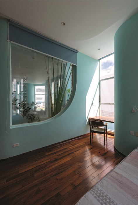 Bằng cách sử dụng những đường cong và bo góc cho những bức tường đã bị ấn định bởi thầy phong thủy để làm không gian mềm mại và an toàn cho trẻ nhưng cũng không sai lệch đi khỏi những hướng tốt mà chủ nhà mong muốn.