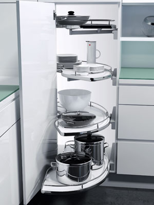 - Ảnh bên : Khay kéo trong tủ bếp mở “tự động” bằng nguyên lý cơ học đơn giản.