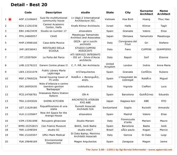 Sau đây là Danh sách rút gọn đã được công bố trong hạng mục “Dân dụng và cộng đồng” (Civic and community) mà công trình Nhà cộng đồng thôn Suối Rè được chọn (nguồn: WAF):