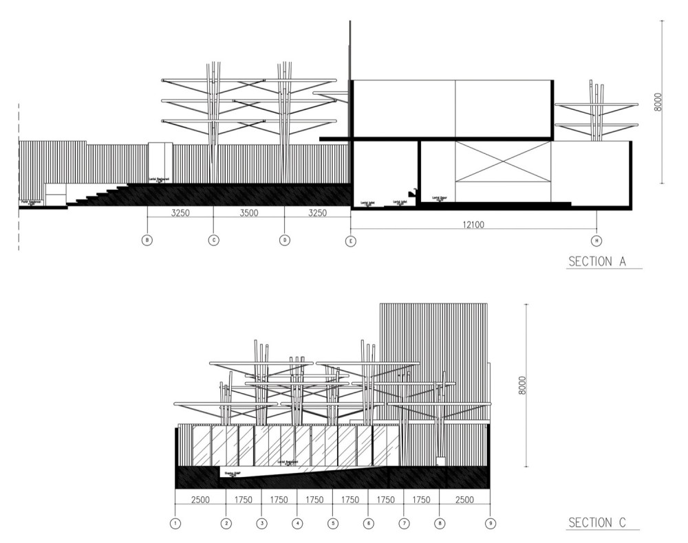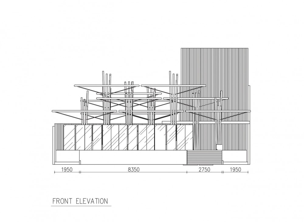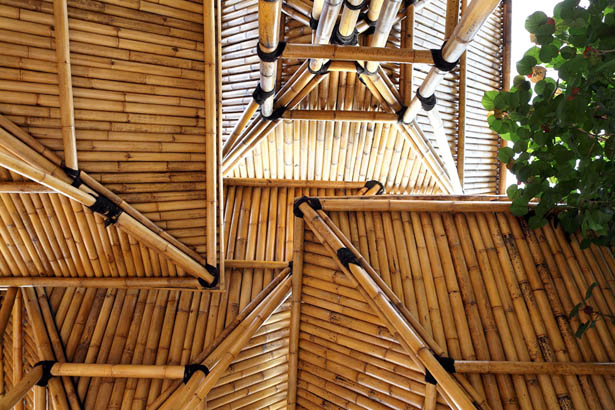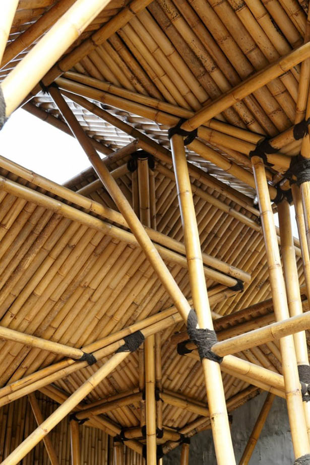 Mái lớn này có công năng che chắn cho công trình và đồng thời là máng thu giữ nước mưa. Nước mưa sẽ được phân đều trực tiếp lên mặt đất thông qua ống dẫn bố trí ngay chính giữa kết cấu công trình, vốn được bao bọc xung quanh bằng những cây tre. Tre là một loại vật liệu chắc chắn và có ít bị biến dạng trong quá trình sử dụng, do vậy các kiến trúc sư của công ty DSA+s đã tạo được một công trình đẹp và rất ấn tượng.