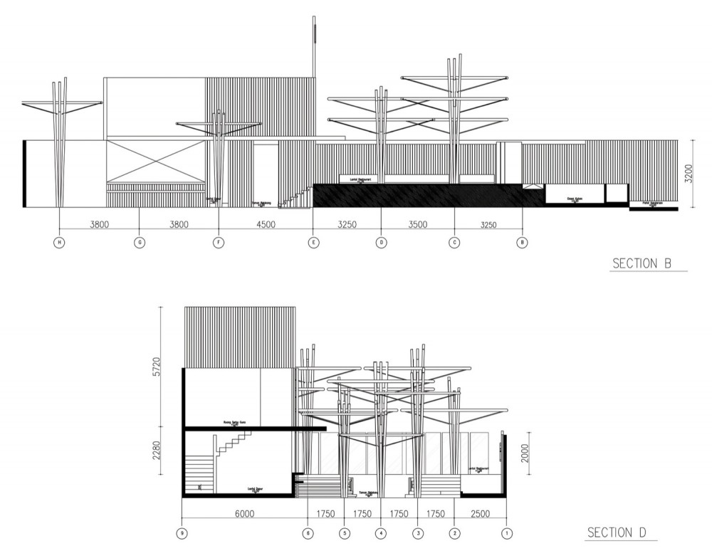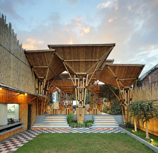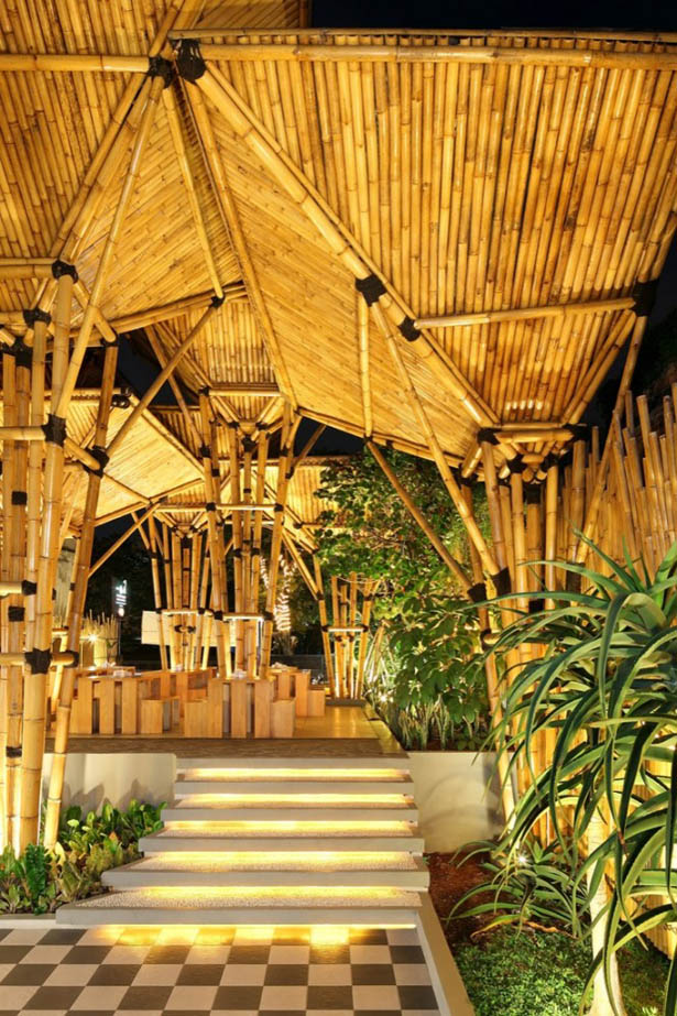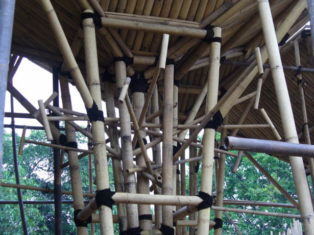 Kết cấu của công trình được thắt chặt với nhau bằng một dây thừng gọi là “ijuk”. Mỗi mái được chịu lực bởi bốn cột bằng tre, được cột chặt lại với nhau với dầm ngang, cũng làm bằng tre, để hình thành nên một cột tre lớn. Những cây cột này đứng trên nền ximăng được xây cao trên nền đất để tránh nước. Các kiến trúc sư cũng tạo nên một mái rộng và cao cho phép gió thổi tự nhiên xuyên suốt thông qua toàn bộ nhà hàng. Phần che phía trên cũng được làm bằng tre bằng cách kết nối các hệ thống kết cấu tre lại với nhau. Hệ thống này được sử dụng nhằm tránh nước mưa nhỏ giọt xuống, và bảo vệ tre khỏi các vết nứt vốn thường xảy ra khi tre bị ánh nắng chiếu trực tiếp.