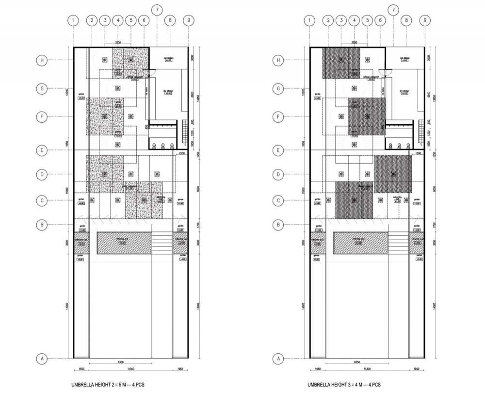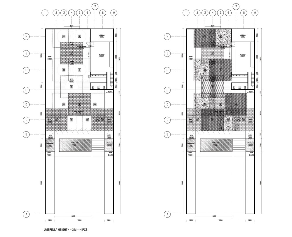 Hình dáng của nhà hàng về mặt cơ bản có cảm hứng từ cái ô. Nhưng nhóm thiết kế có mong muốn hình thành một cái ô khổng lồ và bất thường so với những chuẩn thông thường khác. Hình dáng to lớn sẽ mang lại công năng như một không gian để tạm nương thân. Một nhóm gồm các không gian như vậy kết hợp với nhau hình thành nên công trình, với hy vọng sẽ bảo vệ cho khách nhà hàng khỏi ánh nắng mặt trời, gió và mưa. Các kiến trúc sư đã tạo thành nên một cái ô bằng tre khổng lồ với các kích thước khác nhau (theo chiều rộng và chiều cao) để sắp đặt cái ô khổng lồ này theo cách mà từng ô nhỏ hơn có thể che một phần các ô khác để hình thành nên một mái che lớn cho toàn bộ công trình.