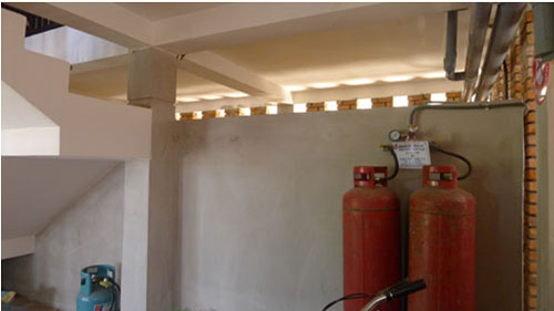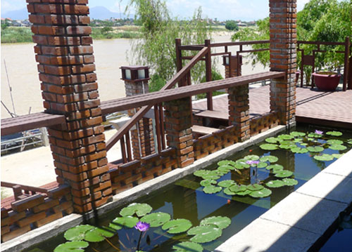 Ngôi nhà nhỏ bên sông Hoài. Bể nước tái sử dụng nước thải để nuôi cá và trồng hoa sen. Bể xử lý nước thải nổi trên mặt đất và nước thải đã xử lý đổ vào bể cá trên sàn tầng 2,3.