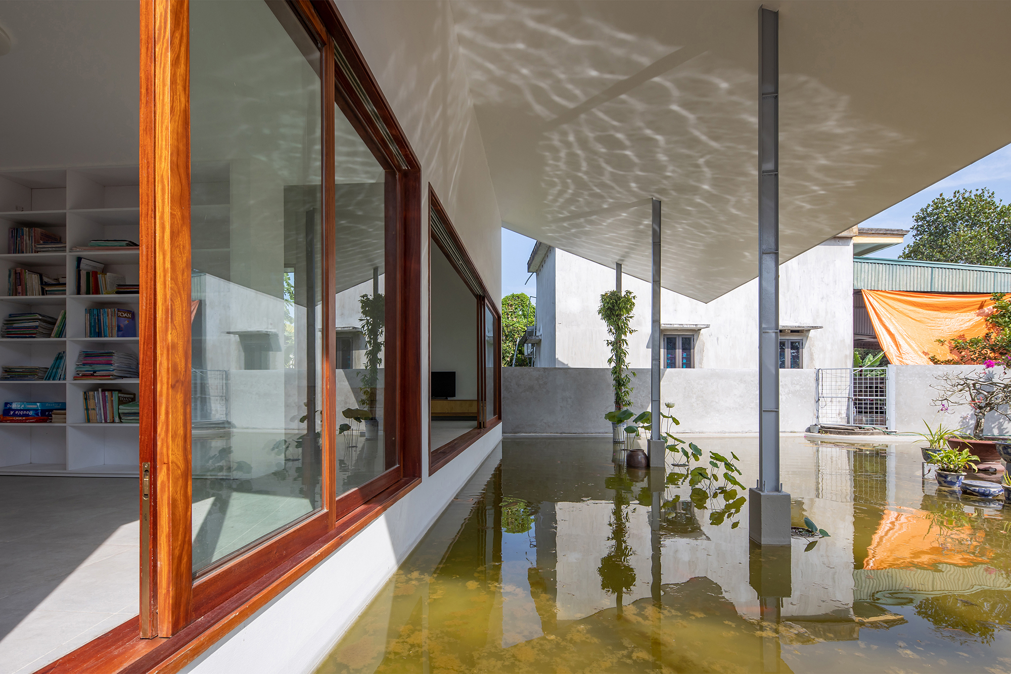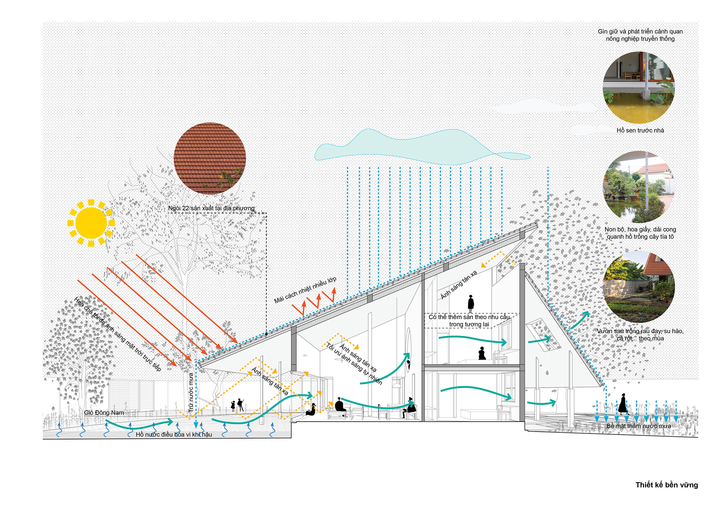 Diện nước lớn phía nam không chỉ mang lại hiệu quả thị giác, giúp nhân đôi không gian phía trước, mà còn giúp ổn định nhiệt độ cho ngôi nhà, ấm áp vào mùa đông, mát mẻ vào mùa hè, khi gió đông nam thổi qua mặt nước trước khi vào nhà. Mái ngói lớn, cách nhiệt nhiều lớp, cùng các khoảng mở cửa với tỉ lệ phù hợp, giúp cho các không gian trong nhà đủ sáng, đủ tối, vừa thoải mái dễ chịu, vừa riêng tư. Hai cột ở hai không gian chính, cây ngoài vườn, cùng với đường cong chạy từ viền sân, viền mặt nước vào nền gạch trong nhà, làm cho cảnh quan và nhà tiếp nối nhau thành một chỉnh thể thống nhất.