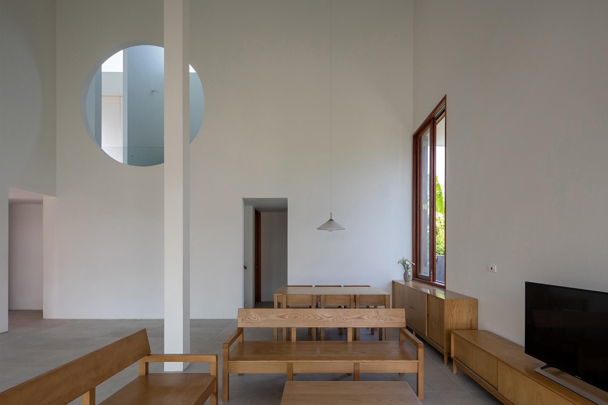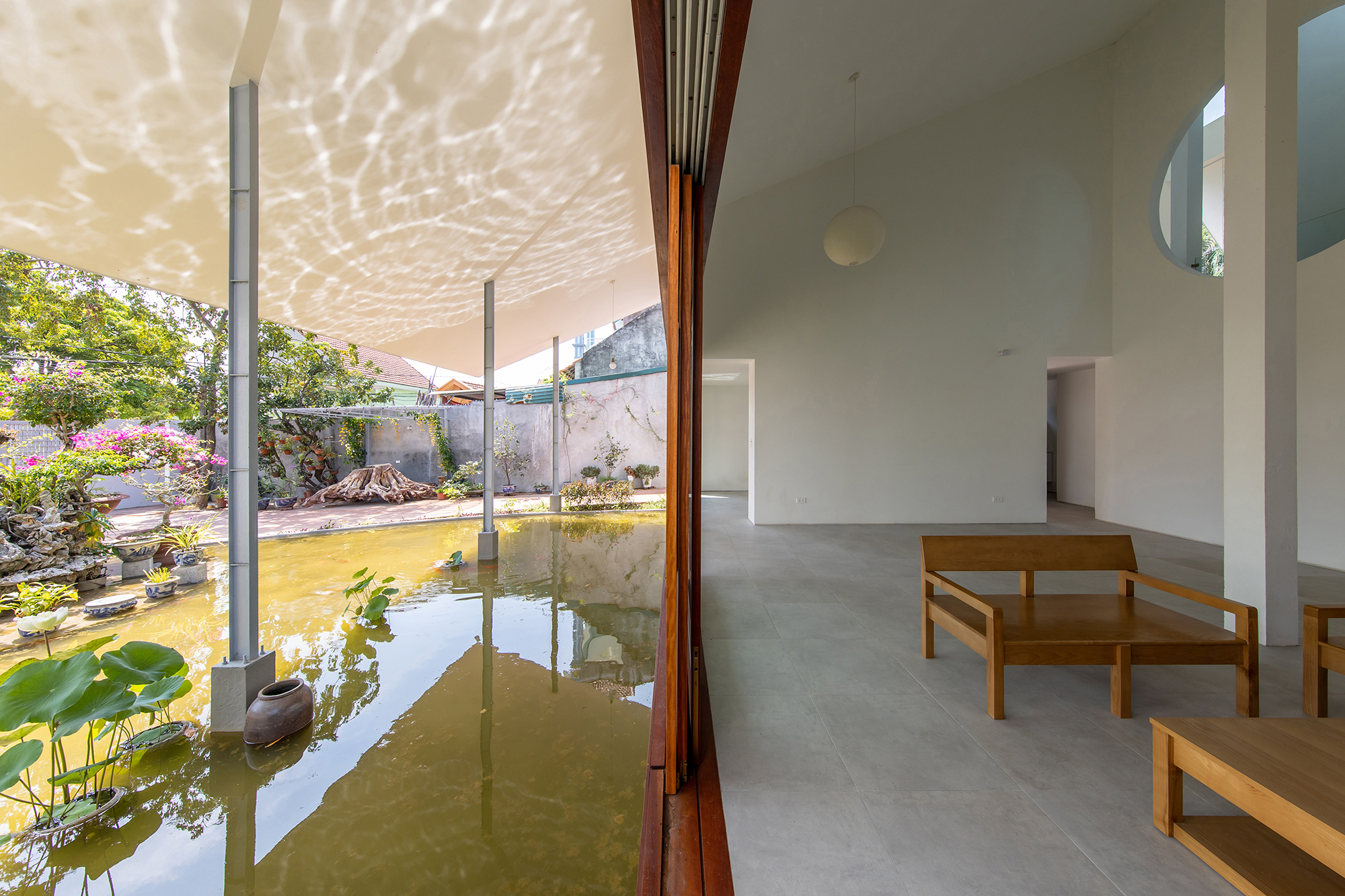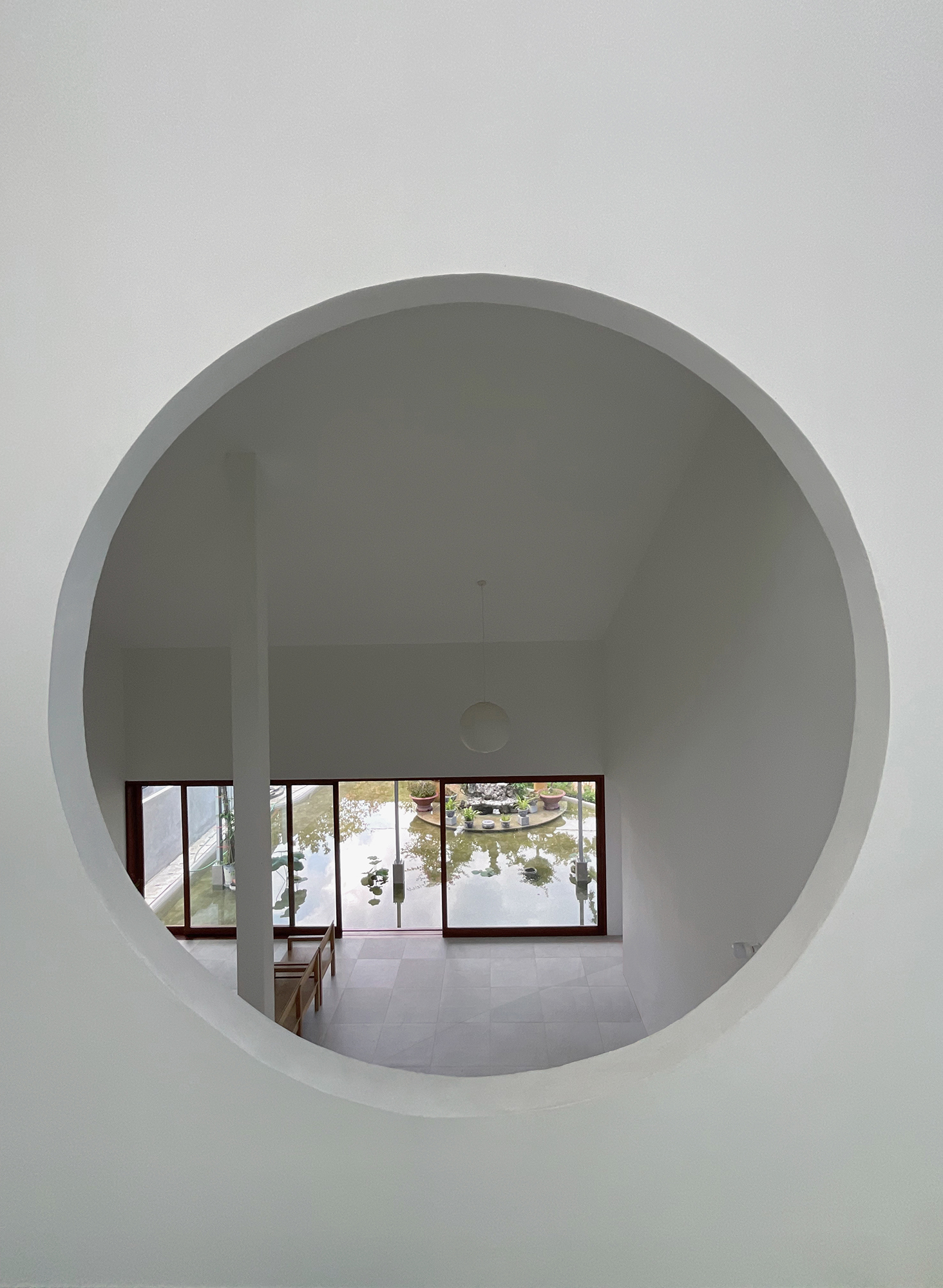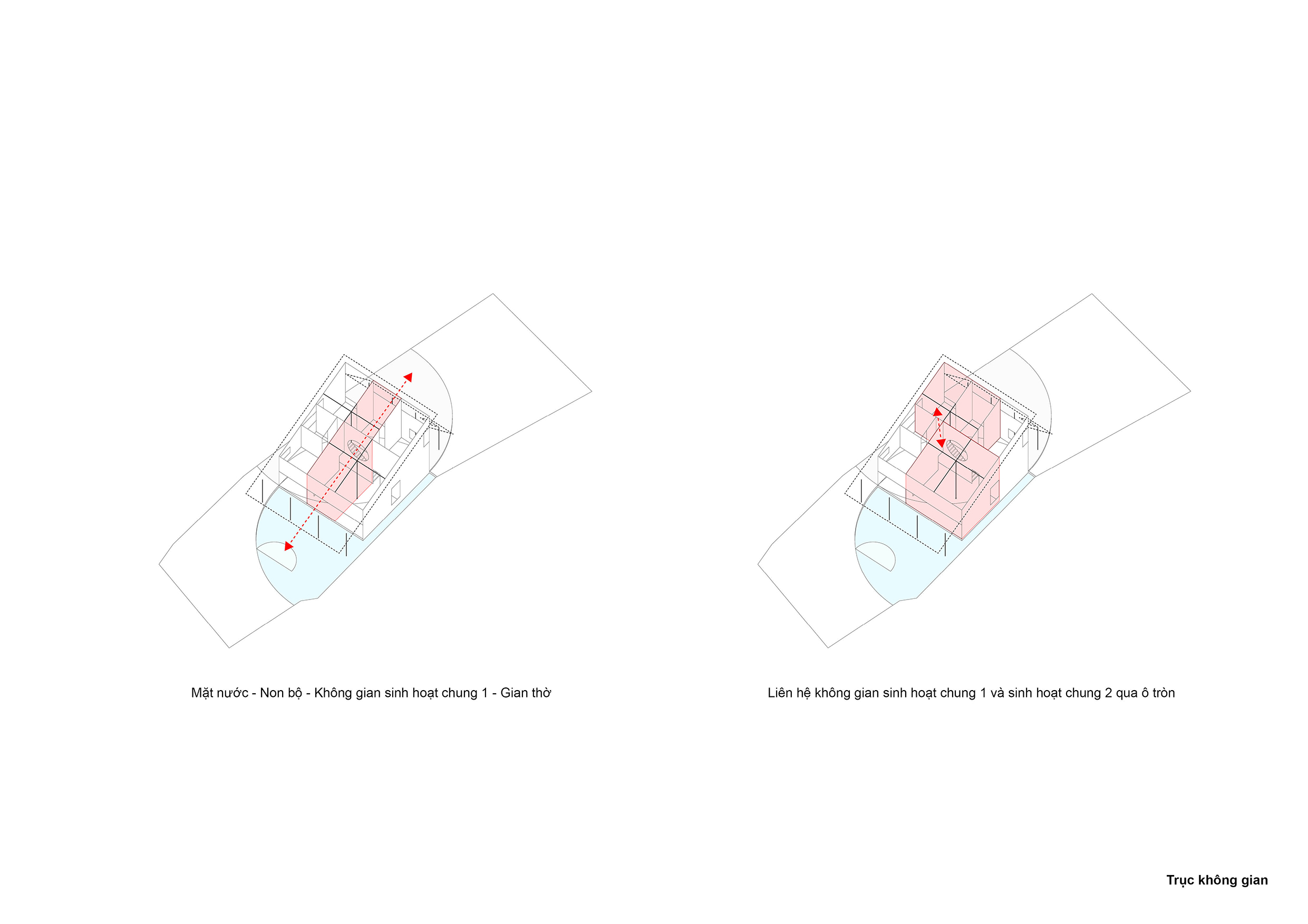 Phía trong nhà, một ô mở tròn kết nối hai không gian chính. Trong khi không gian chính thông tầng phía dưới được phân chia lỏng hơn bởi một cột duy nhất thành 1, 2, 3, hay 4 không gian tuỳ mục đích, không gian chung phía trên bao gồm 3 không gian nhỏ hơn khá rõ ràng, cầu thang, gian sinh hoạt chung, và gian thờ. Thông qua ô mở tròn, gian thờ được mở rộng xuống không gian thông tầng phía dưới, tạo thành trục không gian chính, kết nối mặt nước và cảnh quan phía nam với ánh sáng dịu nhẹ từ hướng bắc qua cửa sổ áp mái. Các phòng ngủ và không gian phụ được bố trí dạng chữ L xung quanh, tiếp biến hình thái của tổ hợp ở trước đây.