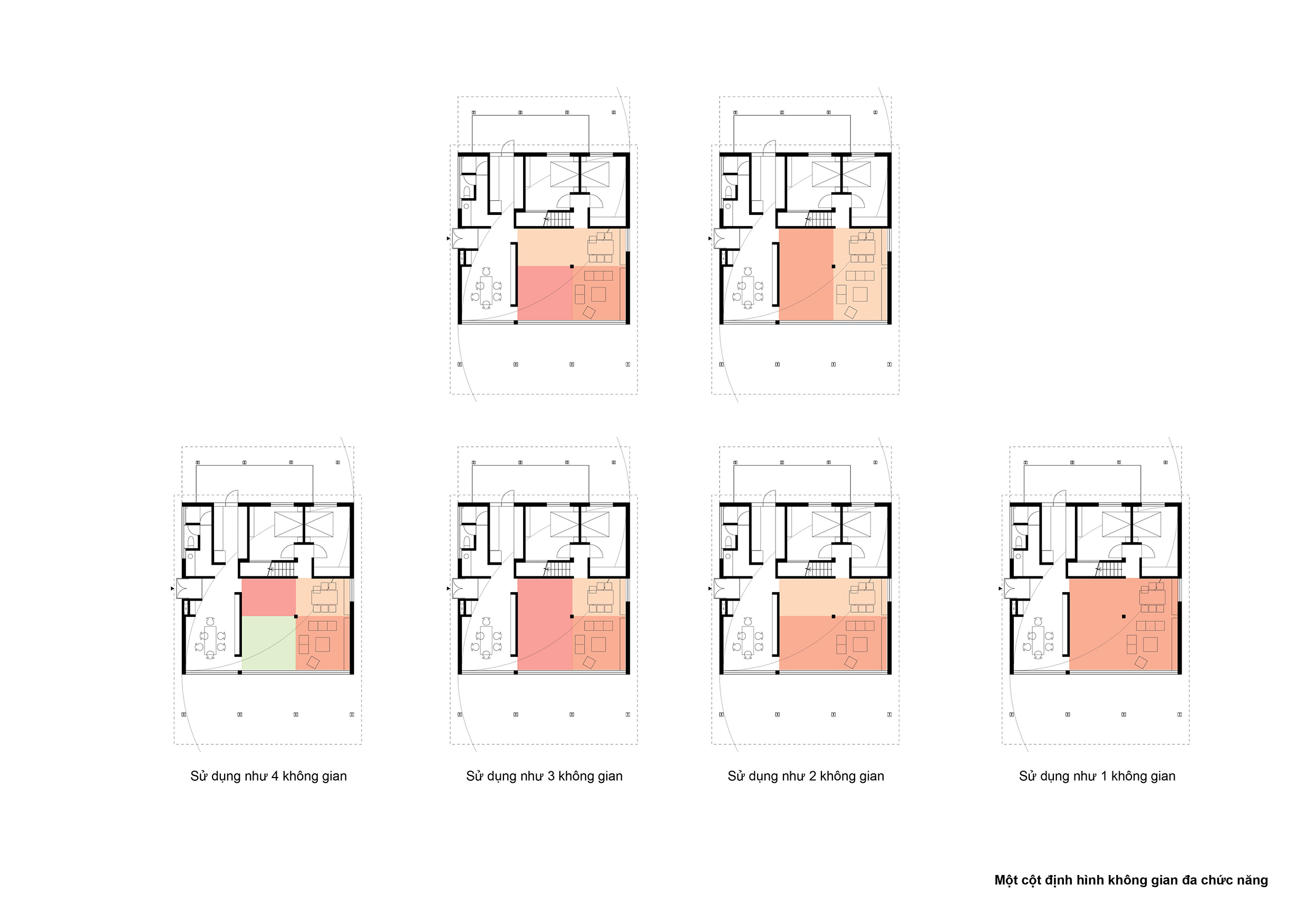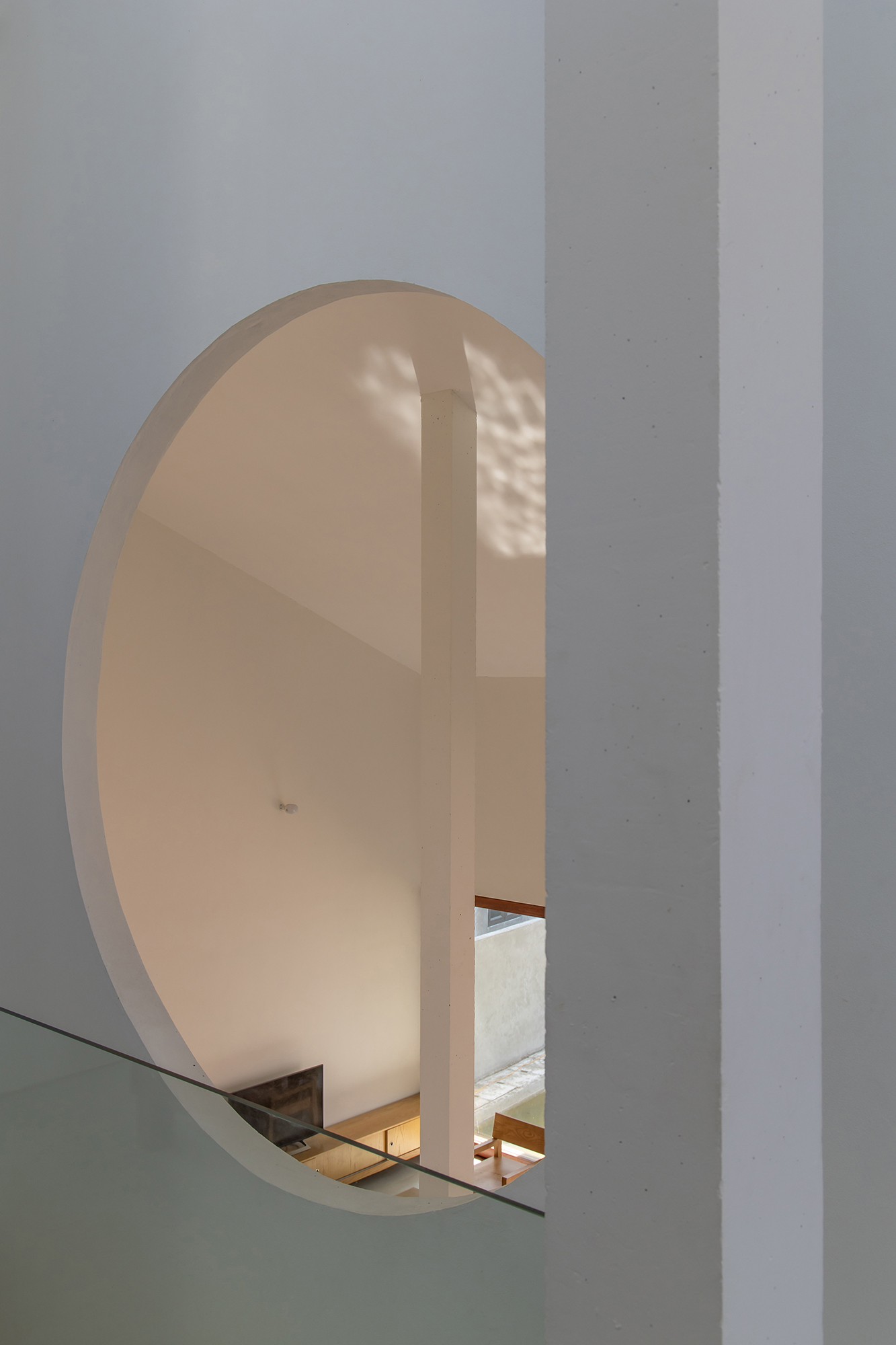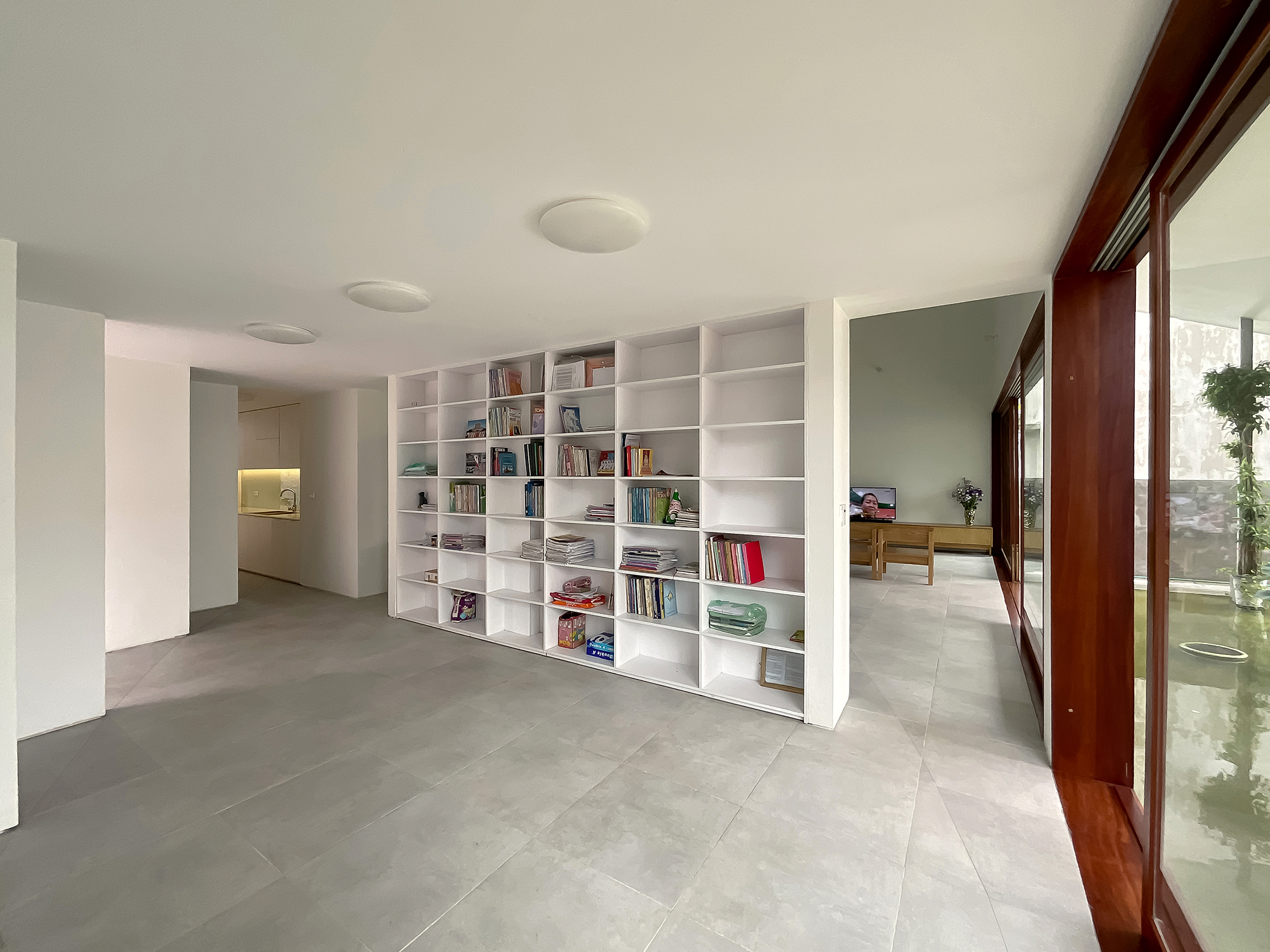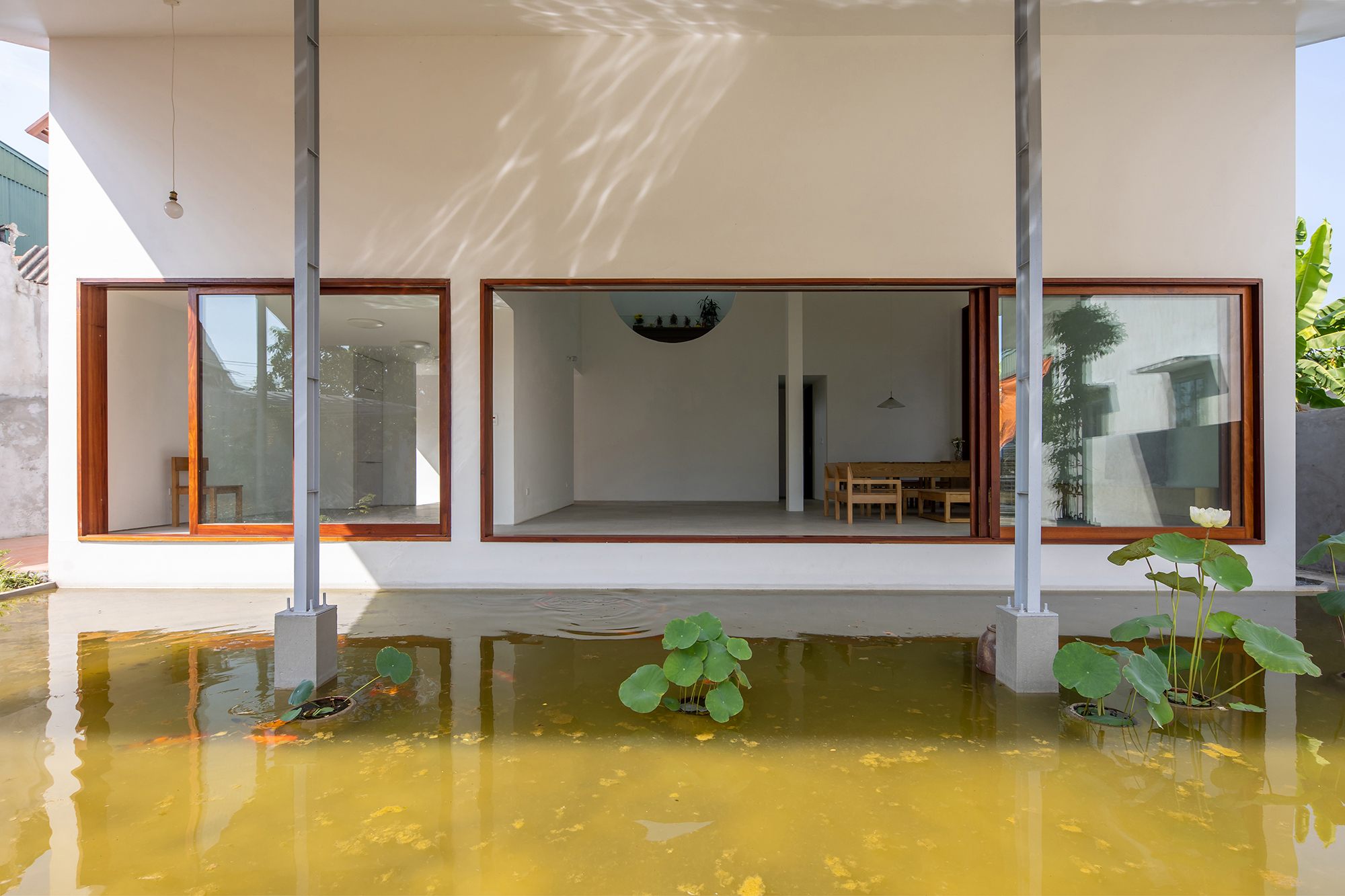 Phía trong nhà, một ô mở tròn kết nối hai không gian chính. Trong khi không gian chính thông tầng phía dưới được phân chia lỏng hơn bởi một cột duy nhất thành 1, 2, 3, hay 4 không gian tuỳ mục đích, không gian chung phía trên bao gồm 3 không gian nhỏ hơn khá rõ ràng, cầu thang, gian sinh hoạt chung, và gian thờ. Thông qua ô mở tròn, gian thờ được mở rộng xuống không gian thông tầng phía dưới, tạo thành trục không gian chính, kết nối mặt nước và cảnh quan phía nam với ánh sáng dịu nhẹ từ hướng bắc qua cửa sổ áp mái. Các phòng ngủ và không gian phụ được bố trí dạng chữ L xung quanh, tiếp biến hình thái của tổ hợp ở trước đây.