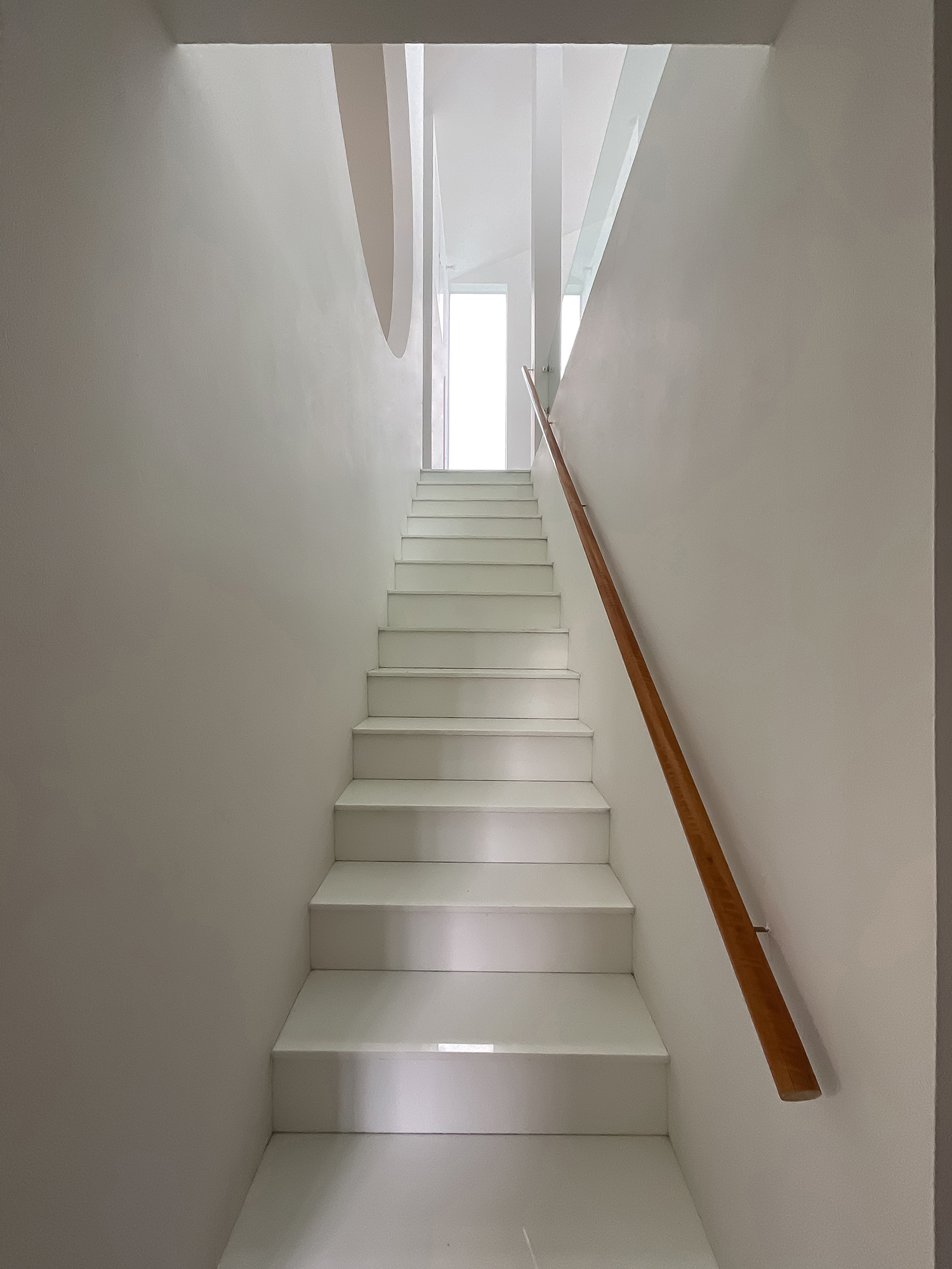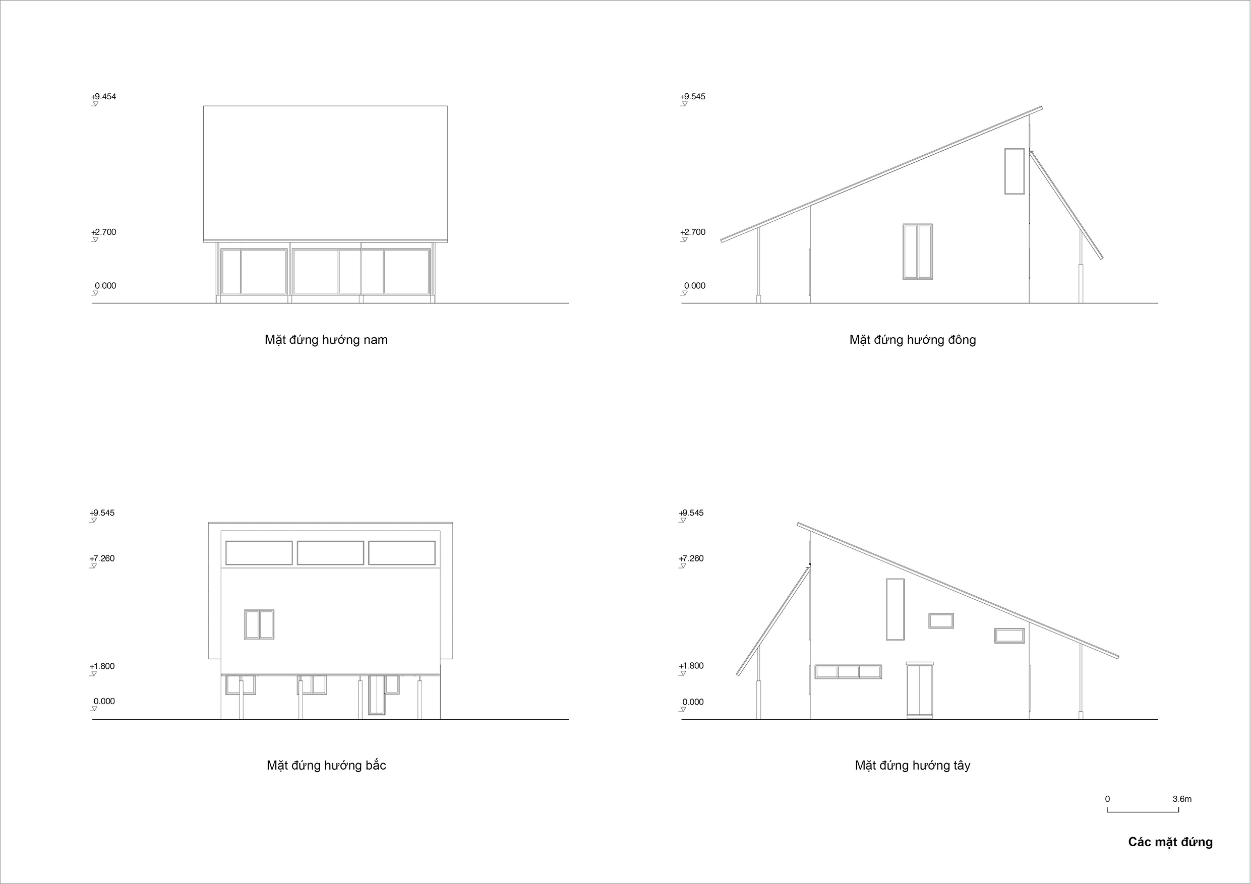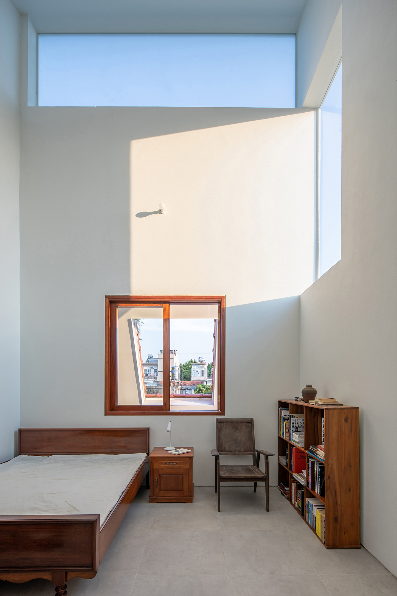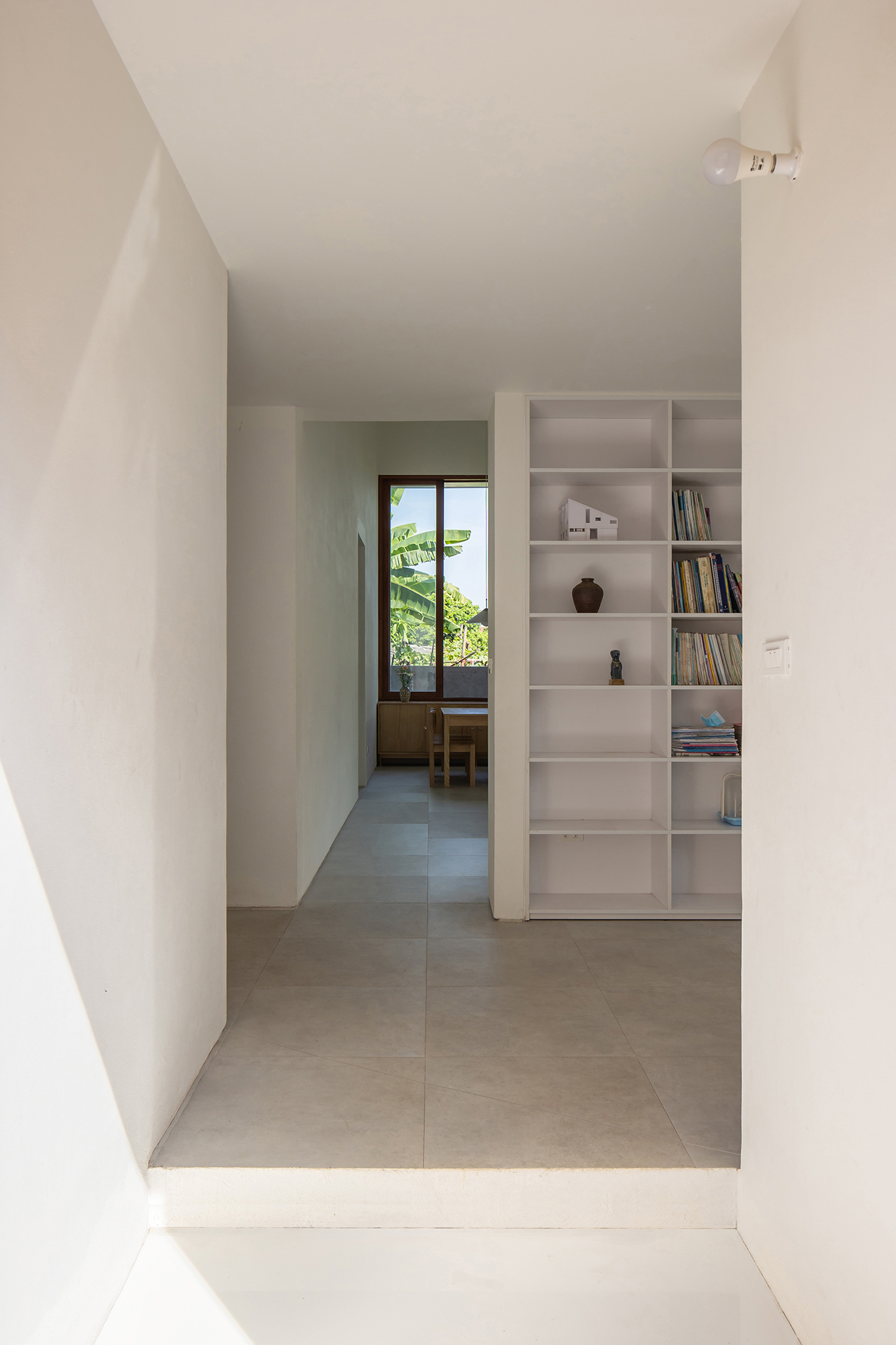 Phía trong nhà, một ô mở tròn kết nối hai không gian chính. Trong khi không gian chính thông tầng phía dưới được phân chia lỏng hơn bởi một cột duy nhất thành 1, 2, 3, hay 4 không gian tuỳ mục đích, không gian chung phía trên bao gồm 3 không gian nhỏ hơn khá rõ ràng, cầu thang, gian sinh hoạt chung, và gian thờ. Thông qua ô mở tròn, gian thờ được mở rộng xuống không gian thông tầng phía dưới, tạo thành trục không gian chính, kết nối mặt nước và cảnh quan phía nam với ánh sáng dịu nhẹ từ hướng bắc qua cửa sổ áp mái. Các phòng ngủ và không gian phụ được bố trí dạng chữ L xung quanh, tiếp biến hình thái của tổ hợp ở trước đây.