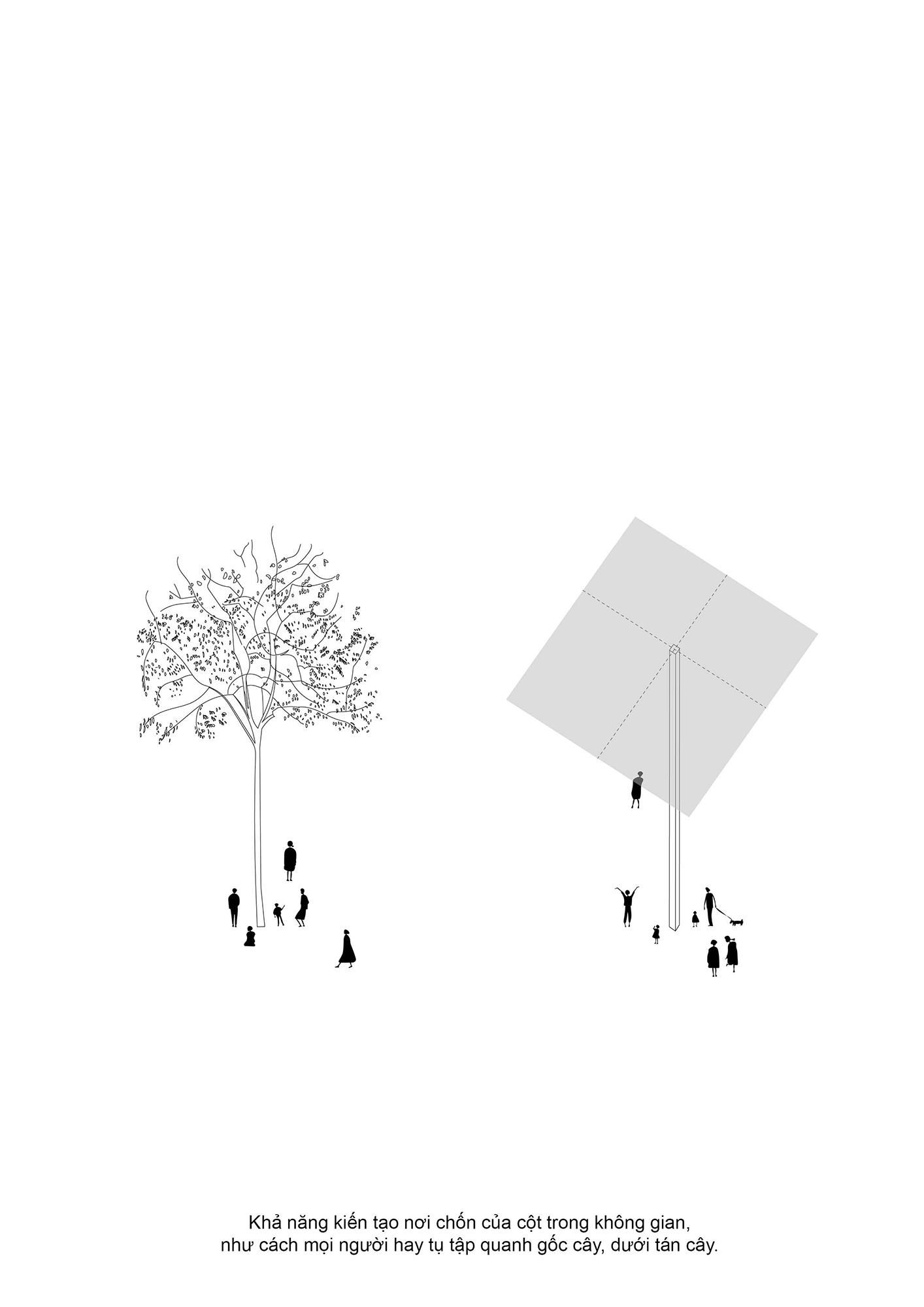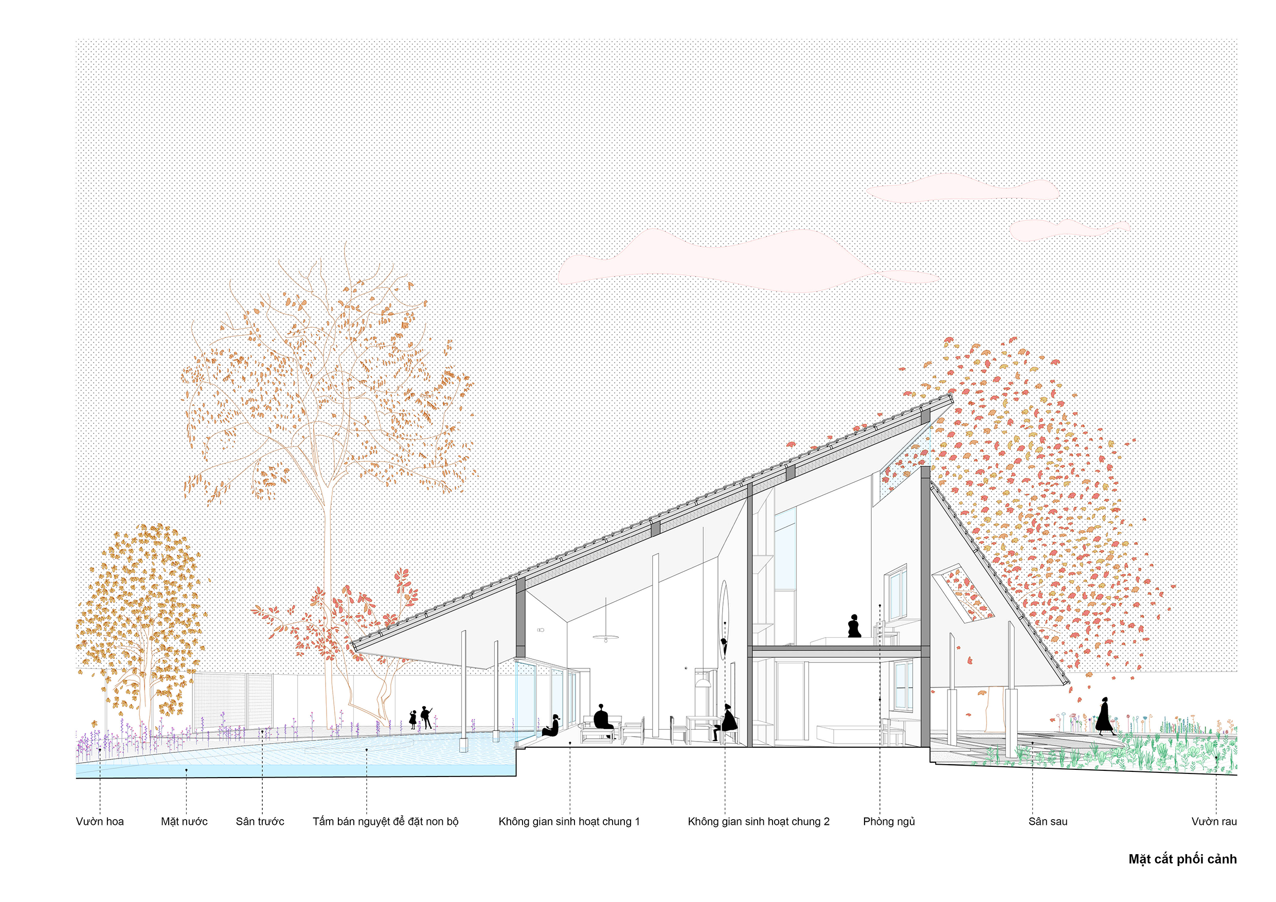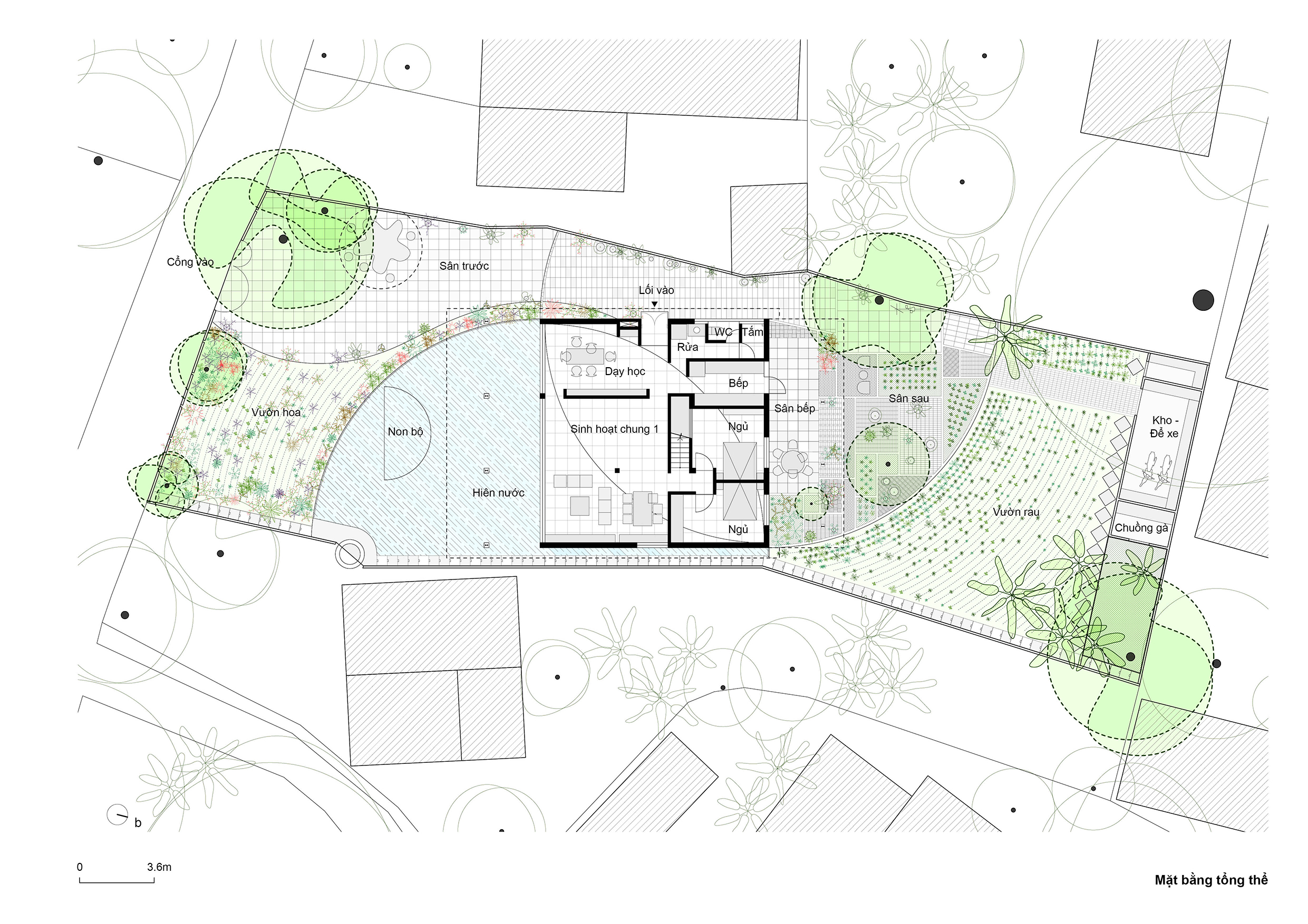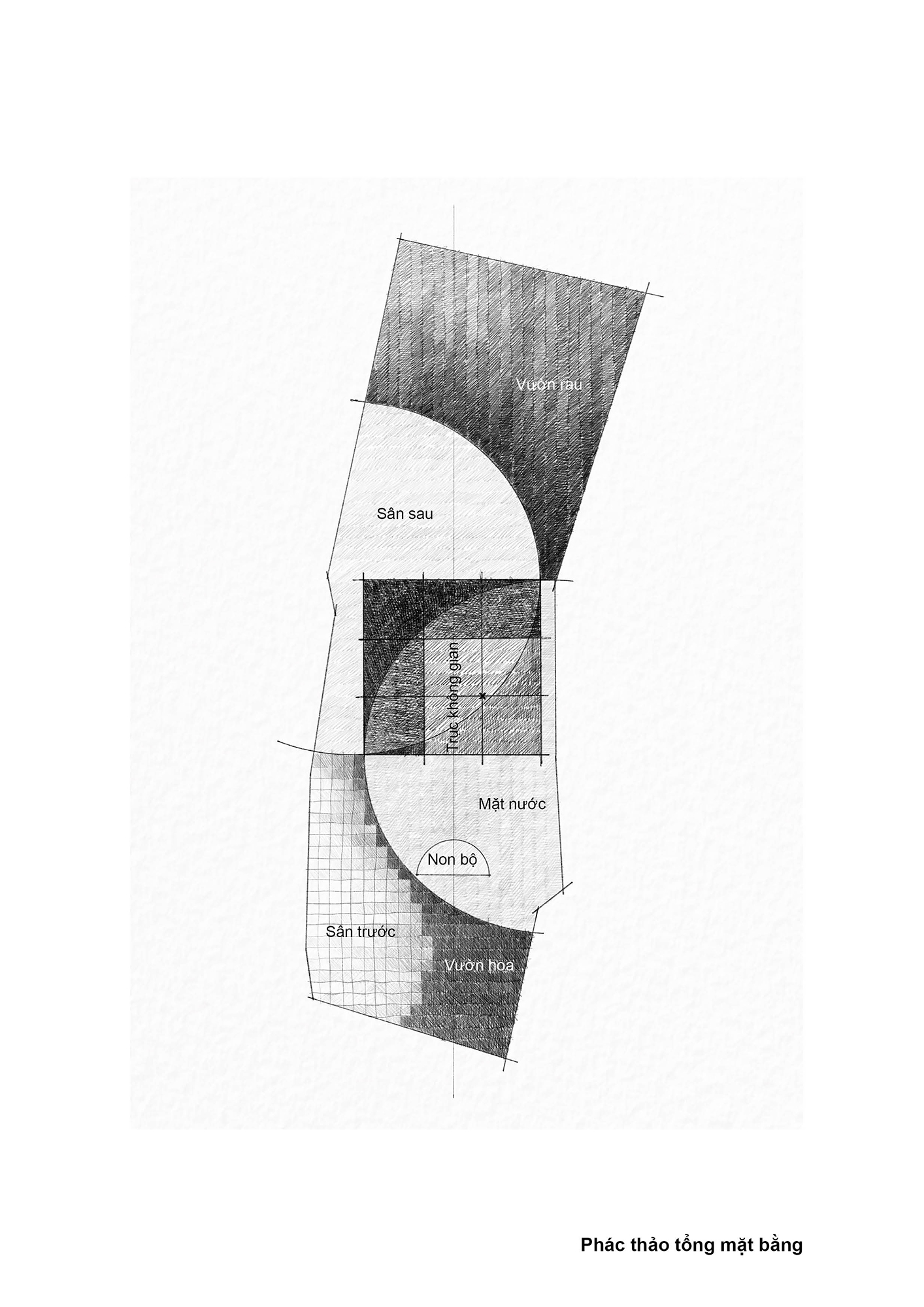 Trung tâm của khu vườn cũ là bể cá hình bán nguyệt, cùng với hòn non bộ, cây cảnh, vườn hoa của ông, vườn rau sau nhà của bà. Khu vườn mới được xây dựng trên hai cung bán nguyệt đan nhau dọc theo chiều dài khu đất, hai điểm giao nhau cùng với hai tâm tạo thành hình vuông, chính là ngôi nhà mới, ở giữa khu đất. Một nửa hình bán nguyệt phía trước tạo thành mặt nước phía nam, nửa sau hình bán nguyệt thứ hai là sân nội bộ, mở rộng không gian bếp, kết nối với vườn rau và chuồng gia cầm phía sau. Phía trước mặt nước sẽ là vườn hoa và sân gạch đỏ dẫn vào nhà.