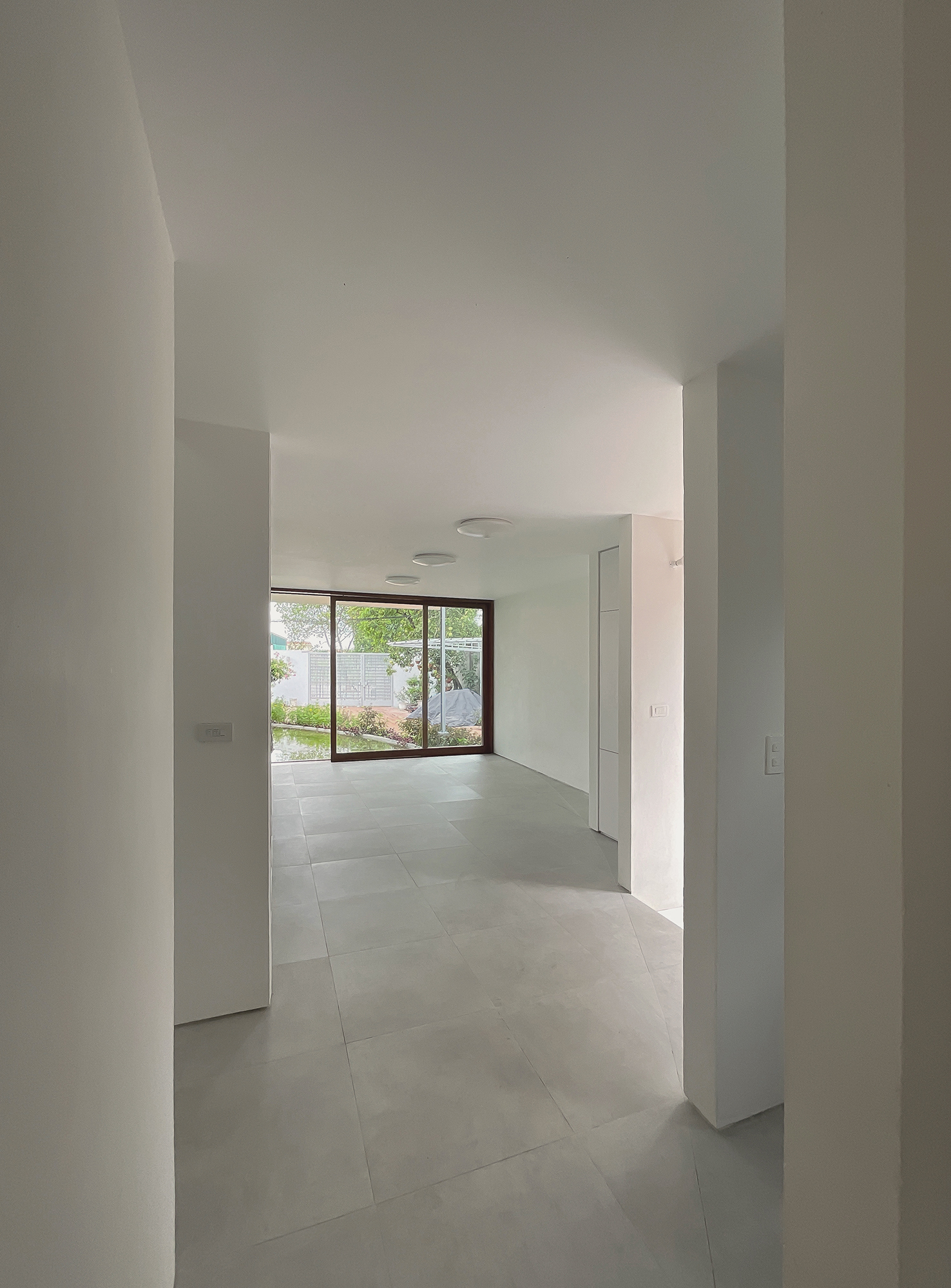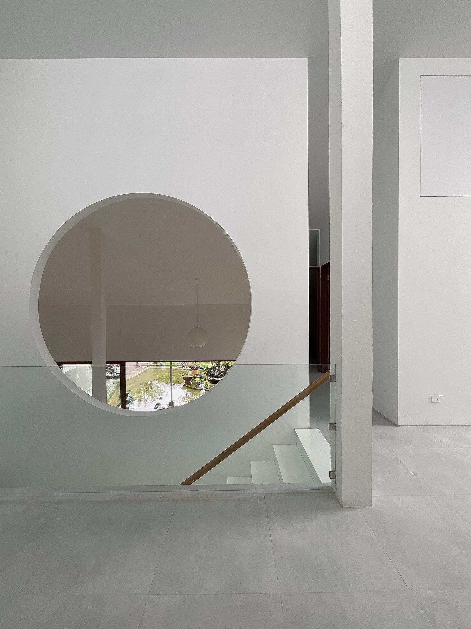Phía trong nhà, một ô mở tròn kết nối hai không gian chính. Trong khi không gian chính thông tầng phía dưới được phân chia lỏng hơn bởi một cột duy nhất thành 1, 2, 3, hay 4 không gian tuỳ mục đích, không gian chung phía trên bao gồm 3 không gian nhỏ hơn khá rõ ràng, cầu thang, gian sinh hoạt chung, và gian thờ. Thông qua ô mở tròn, gian thờ được mở rộng xuống không gian thông tầng phía dưới, tạo thành trục không gian chính, kết nối mặt nước và cảnh quan phía nam với ánh sáng dịu nhẹ từ hướng bắc qua cửa sổ áp mái. Các phòng ngủ và không gian phụ được bố trí dạng chữ L xung quanh, tiếp biến hình thái của tổ hợp ở trước đây.