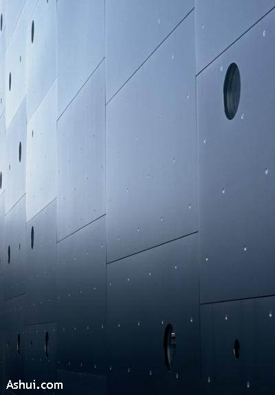 Tương phản với tấm thép hình chữ nhật là những ô cửa sổ hình tròn sinh động rải đều trên khắp bề mặt, tạo ra những chùm tia sáng, chiếu sáng cho nội thất bằng nguồn ánh sáng tự nhiên