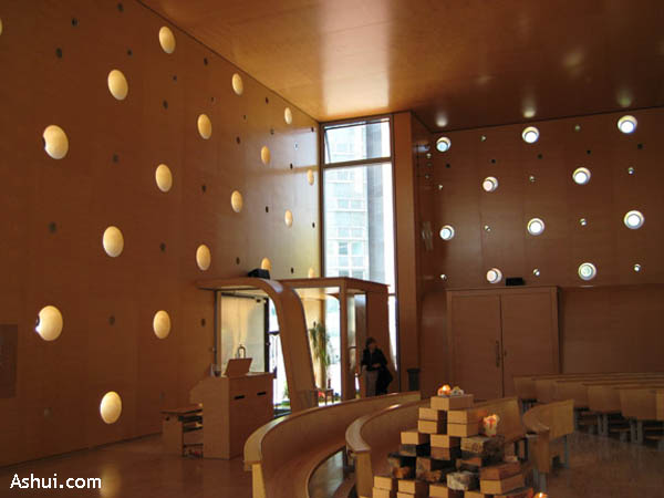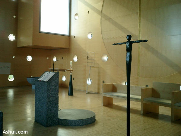 Bạc, gỗ và thép crom đã được Tesar cùng với con trai của ông – Marc sử dụng để tạo nên một không gian kiến trúc tôn giáo không kém phần sinh động nhưng gần gũi và ấm cúng, khác với phong cách nhà thờ truyền thống uy nghi, biểu trưng của sức mạnh.