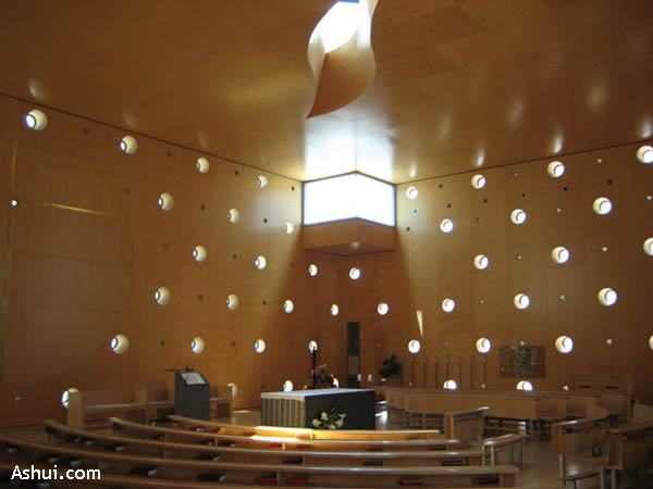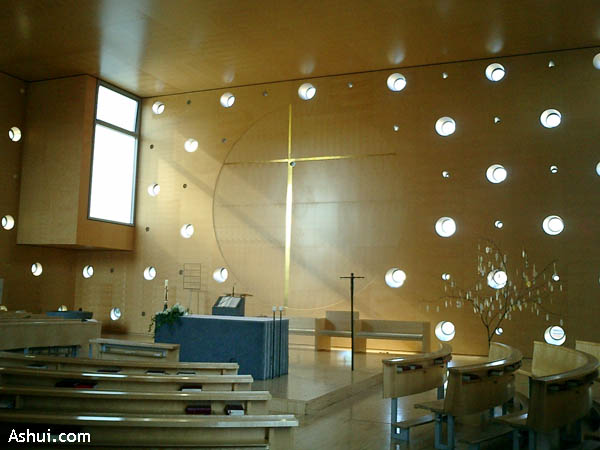 Trái ngược với bề mặt, nội thất bên trong nhà thờ lại tạo cảm giác ấm cúng và thân thiện bởi những tấm gỗ ốp bulô trên trần, tường và sàn của nhà thờ. Màu đơn sắc và nội dung bên trong nhà thờ cũng đơn giản như xu hướng chung trong thiết kế hiện đại. Những lỗ tròn cửa sổ là khởi nguồn cho “trò chơi về ánh sáng” đầy sức lôi cuốn và thú vị cho không gian tâm linh và nghiêm trang của nhà thờ. Phía trên trần là lỗ hổng hình dấu “ngã” mà người ta gọi đó là “cửa thiên đàng”. Phía dưới là bàn thờ được làm bằng đá khối màu đen, tâm điểm của không gian dành cho linh mục, xung quanh bố trí những hàng ghế dài hình bán nguyệt đối lập với đường thẳng, khoẻ khoắn của khối hộp chữ nhật, hướng về tâm điểm bàn thờ. Bức tường phía đông được kết hợp với lớp gỗ ốp hình tròn, bên trong là thập giá bằng vàng lấp lánh. Chức năng nghi thức nhà thờ vẫn được tổ chức theo truyền thống, lối vào nằm ở hướng  nam, bên cạnh lối thoát nằm ở mặt phía tây, trong khi không gian phục vụ của nhà thờ vẫn được đặt ở phía tây, ẩn sau những tấm gỗ  lồi được uốn cong.