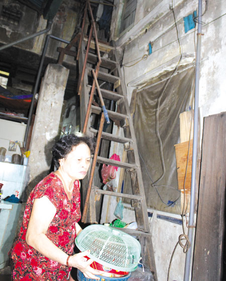 Bà Nguyễn Thị Quế sống trọn cuộc đời làm dâu ở căn nhà này không khỏi bùi ngùi khi kể lại những lần nhà đổ: “Năm ngoái, đúng 28 tết, trong khi cả nhà đang chuẩn bị ăn tết thì mái trên của nhà đổ sập xuống, khiến tôi suýt chết. Tết nhất đến rồi, không che đậy lại thì mưa ngập nhà. Những ngày đó cửa hàng vật liệu xây dựng người ta nghỉ cả rồi. Đành phải mua bạt phủ lên làm mái nhà. Giữa Thủ đô, mà sống không bằng ngoài bờ bãi, ăn tết cũng không yên ổn“.
