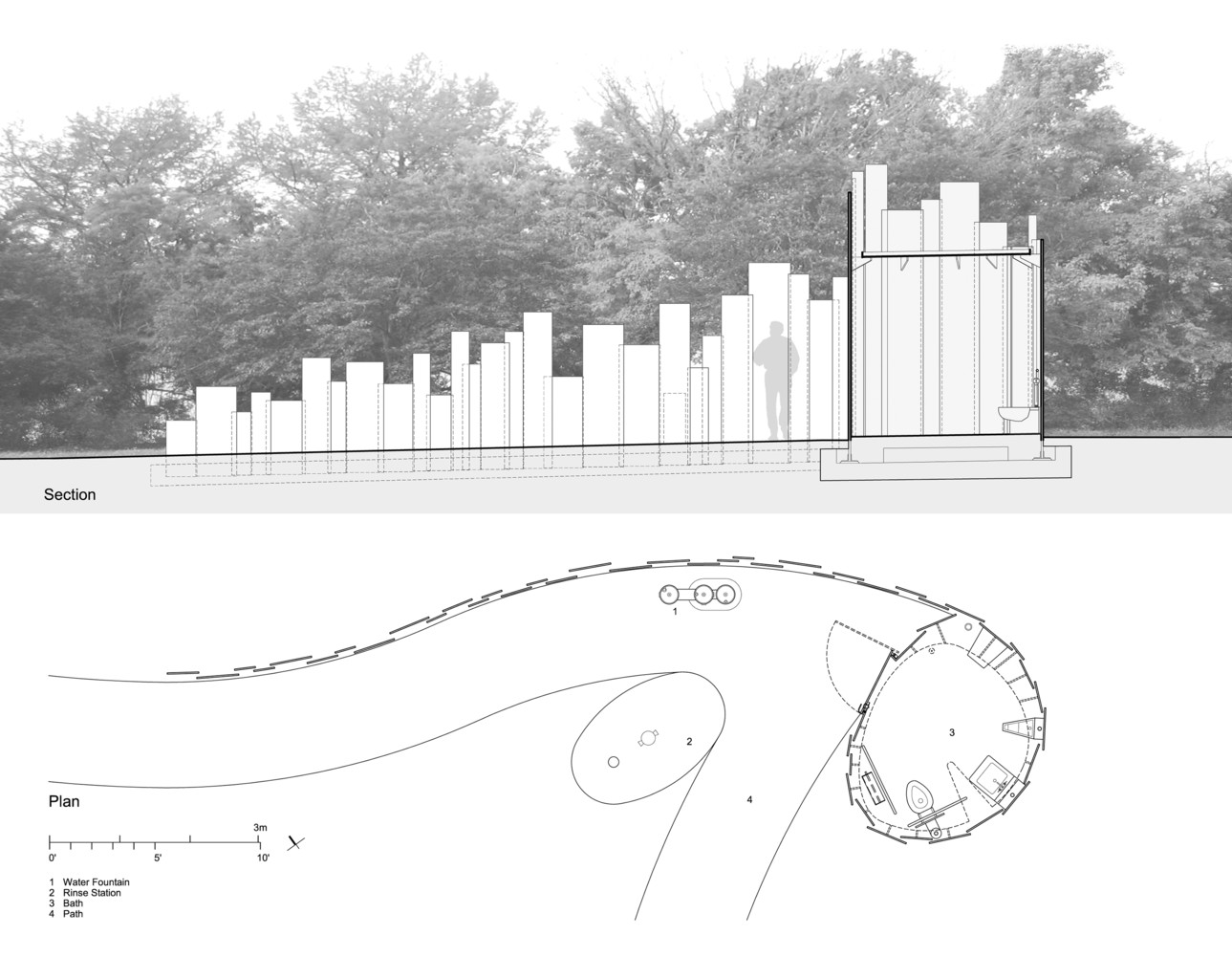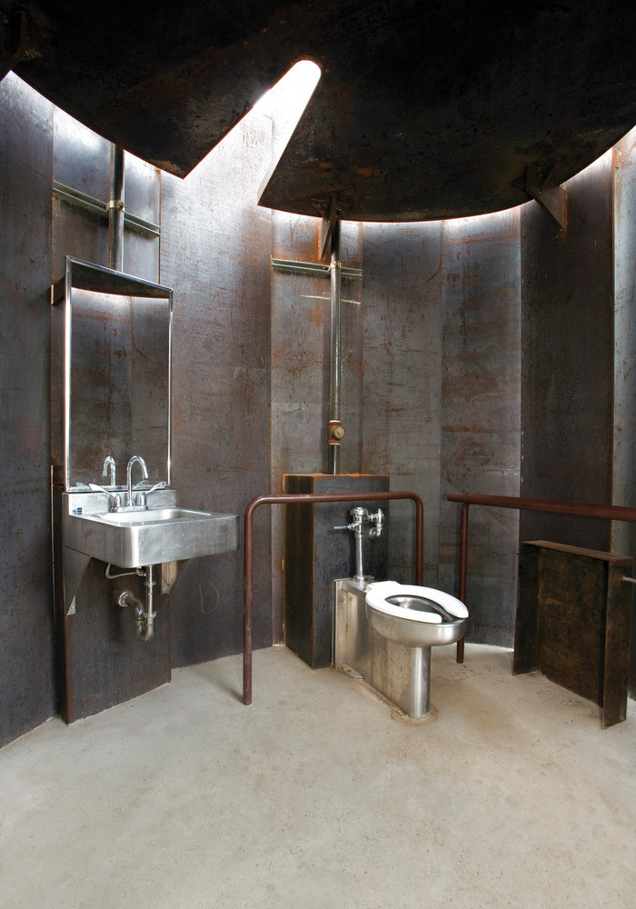 Nhà vệ sinh dễ dàng cho người khuyết tật tiếp cận, có một vòi nước uống và vòi hoa sen bên ngoài, với một chỗ đi lại, bồn tiểu, bồn rửa và băng ghế ở bên trong. Công trình đơn giản này có mức bảo trì tối thiểu: các thiết bị ống nước được làm từ thép không gỉ chịu lực, không cần ánh sáng nhân tạo hoặc thông gió cơ khí bên trong, và các tấm thép Corten sẽ tồn tại tự nhiên theo thời gian.