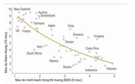 Theo các dữ liệu điều tra, người ta đã lập đồ thị thể hiện mối quan hệ giữa chỉ số minh bạch và mức độ tham nhũng tại các nước tiến hành khảo sát, đây là quan hệ tỷ lệ thuận. Trên đồ thị, thấy rõ Việt Nam là nước thuộc nhóm tham nhũng cao và minh bạch thấp.