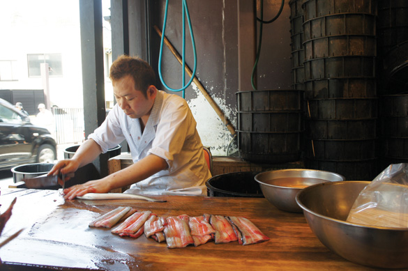 Những cửa hàng cơm lươn san sát trên phố Omote-sando. Nét độc đáo của cơm lươn ở đây là thực khách được nhìn tận mắt món ăn của mình được chế biến như thế nào. Màn làm lươn được đầu bếp trình diễn thoăn thoắt: Những con lươn chỉ bé bằng cái đũa được bắt, lột da, mổ lấy ruột và cắt từng khúc, xiên vào que tre và cho vào lò nướng.