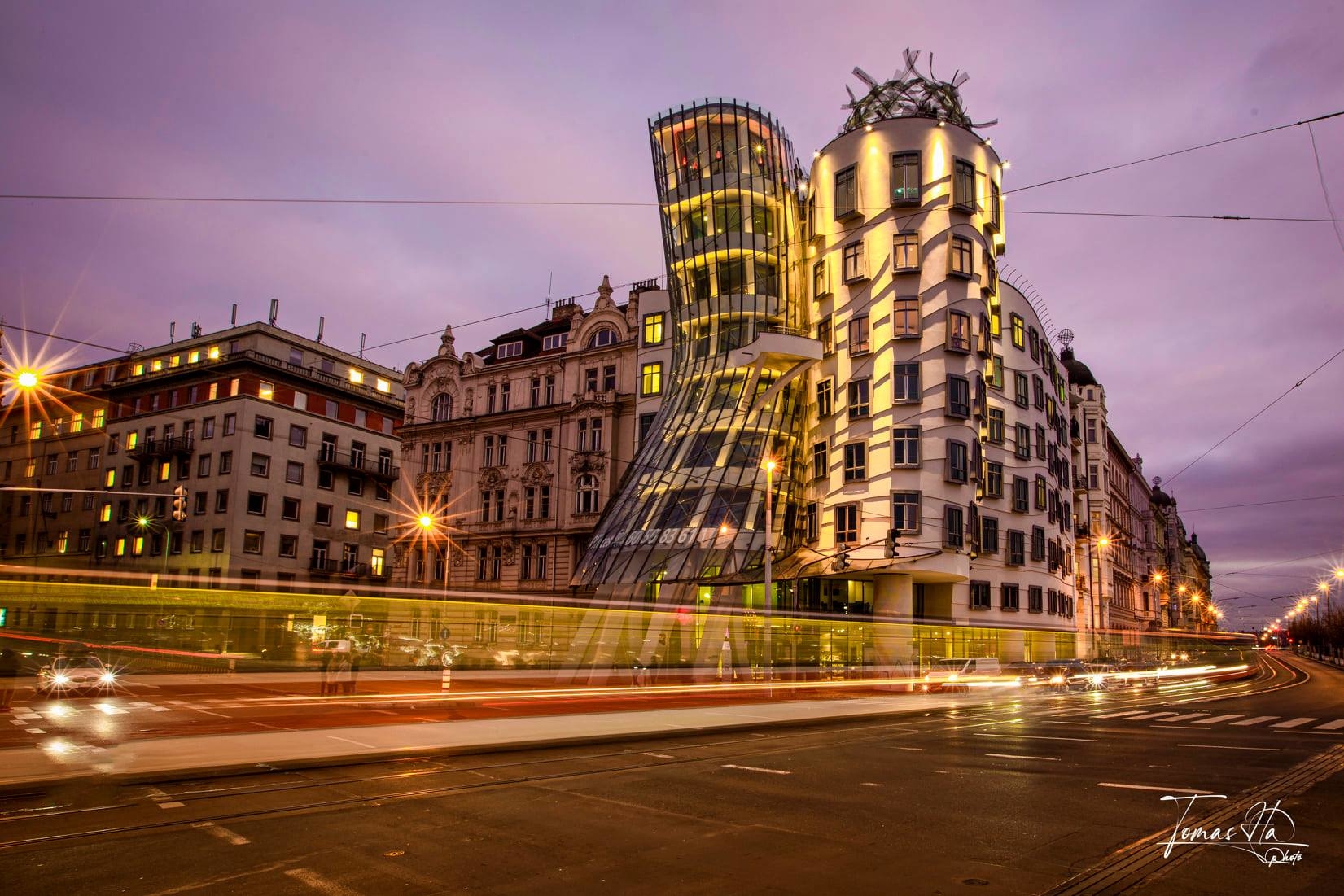 Trong ảnh là Dancing House (tòa nhà khiêu vũ) nổi tiếng. Nằm giữa các tòa nhà vuông vắn kiểu tân Baroque, tân Gothic và tân nghệ thuật từ thế kỷ 18 và 19, Dancing House nổi bật với thiết kế rất phi truyền thống. Điều đó khiến nó càng trở nên nổi bật trong thố thị Praha nhộn nhịp.