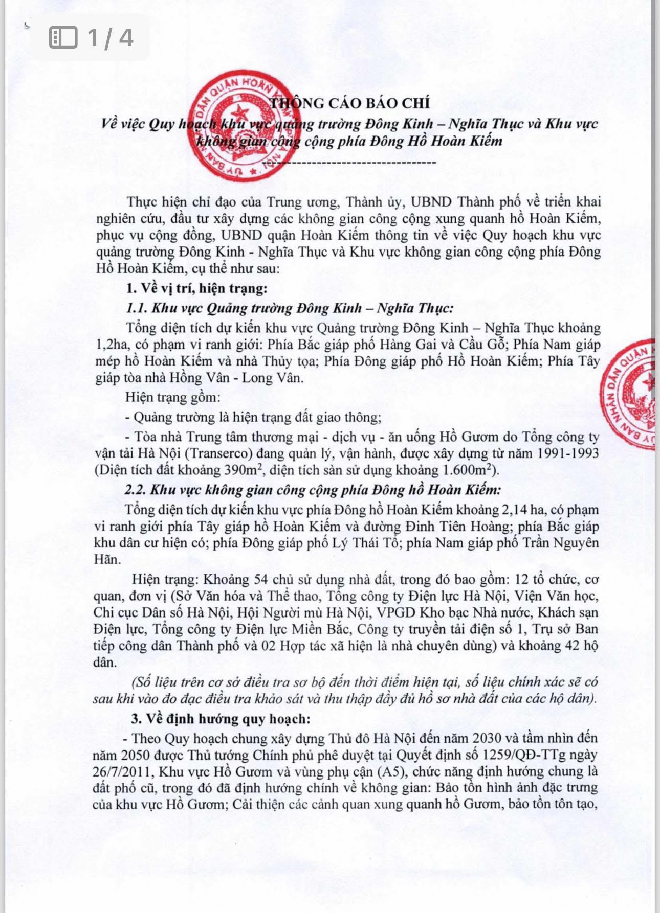 Ngày 19/3, UBND Quận Hoàn Kiếm đã thông tin về công tác quy hoạch các không gian công cộng xung quanh hồ Hoàn Kiếm, phục vụ cộng đồng. Theo đó, khu vực Quảng trường Đông Kinh – Nghĩa Thục có diện tích khoảng 1,2ha; Phía Bắc giáp phố Hàng Gai và Cầu Gỗ; phía Nam giáp mép hồ Hoàn Kiếm và nhà Thủy tọa; phía Đông giáp phố Hồ Hoàn Kiếm; phía Tây giáp tòa nhà Hồng Vân – Long Vân.