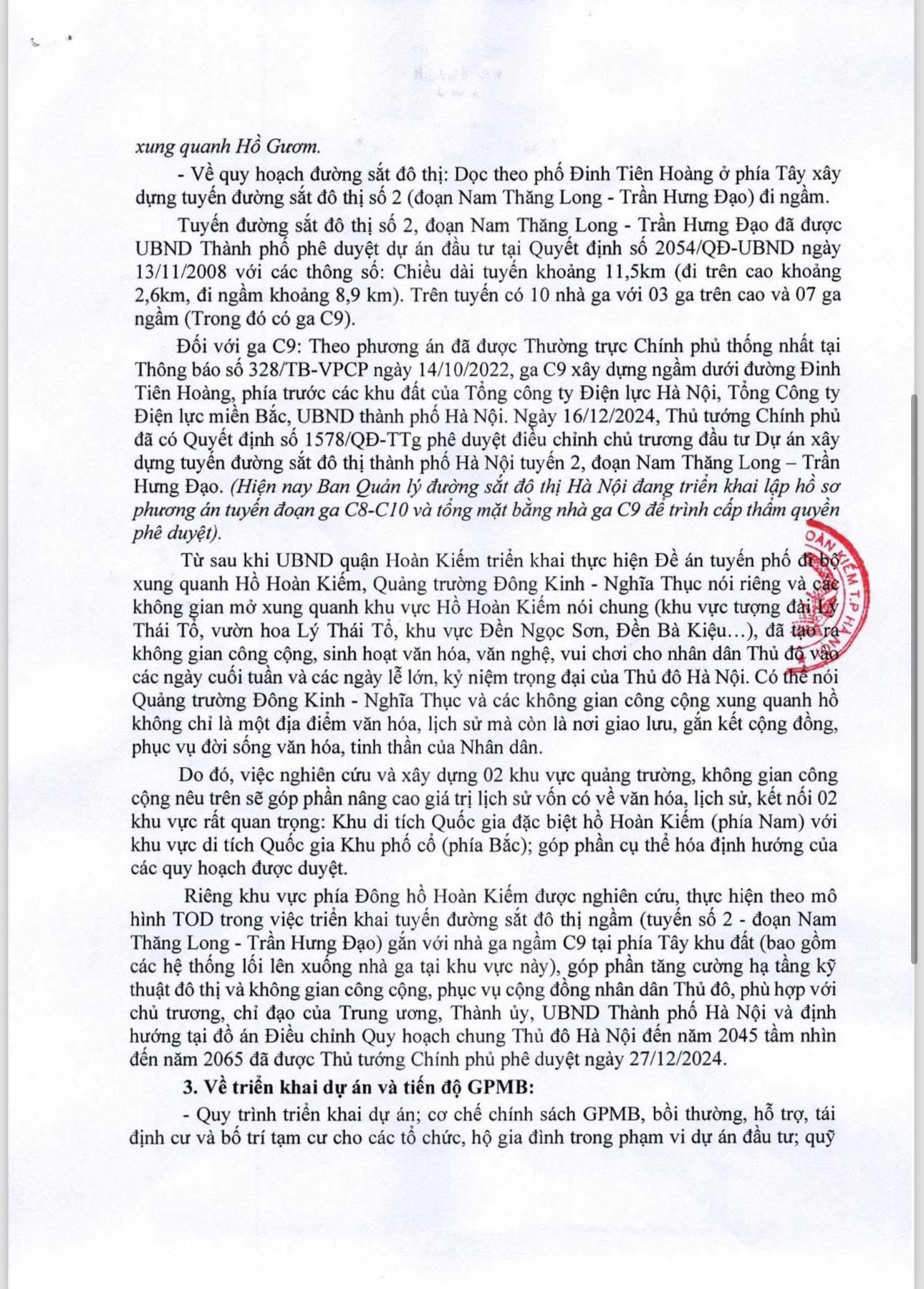 Về tiến độ giải phóng mặt bằng và triển khai dự án, UBND quận Hoàn Kiếm cho biết, hiện các Sở, ngành của Thành phố và các địa phương có liên quan khẩn trương nghiên cứu, đề xuất cơ chế chính sách giải phóng mặt bằng, bồi thường, hỗ trợ, tái định cư và bố trí tạm cư cho các tổ chức, hộ gia đình trong phạm vi dự án đầu tư; đề xuất quỹ đất dự kiến bố trí tái định cư và báo cáo UBND Thành phố theo chỉ đạo, đảm bảo tiến độ di dời theo đúng kế hoạch đề ra.